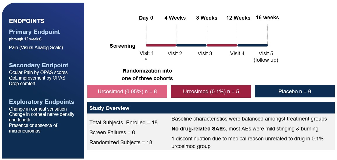 The study enrolled 18 patients at a single site (TMC in Boston, MA) with 17 patients completing the study. One patient was withdrawn due to a medical reason not related to drug. Subjects were randomized in a 1:1:1 ratio to receive topical delivery to the eye of 0.05% urcosimod, or 0.1% urcosimod, or placebo, four times daily for 12 weeks.