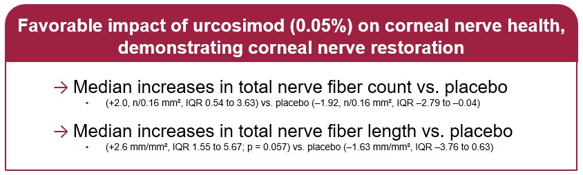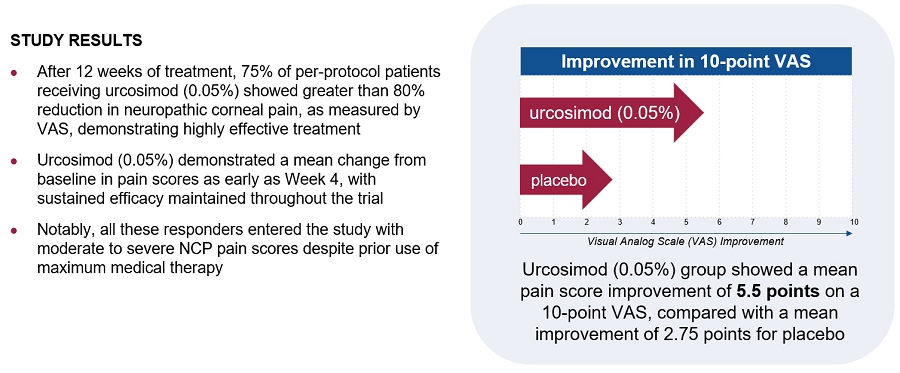 | 1) | Most importantly, the results of a recent proof-of-concept Phase 2a clinical trial of urcosimod to treat NCP (released in July 2025), demonstrated urcosimod’s potential pain-reducing effect and corneal nerve restoration in patients with NCP . NCP patients were specifically enrolled in the trial, utilizing a confocal microscopy diagnostic to ensure they were suffering from NCP. |
