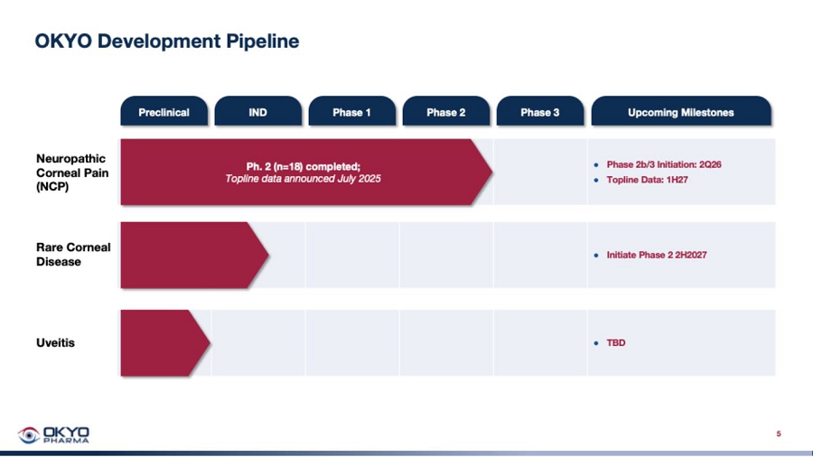 On July 16, 2025, we announced results from the 18-patient Phase 2a trial of urcosimod to treat NCP patients. This randomized, double-masked, placebo-controlled, Phase 2a Proof-of-Concept trial of urcosimod to treat NCP was conducted at a single trial site at TMC in Boston, MA, with Pedram Hamrah, M.D., a leading expert in NCP, as Principal Investigator. An important point to remember regarding analysis of the data from the trial was that the trial was specifically designed with the intent of enrolling 48 patients, needed to power the trial for statistically significant p values against placebo in the study. OKYO announced in April (see April 30, 2025 paragraph above) the decision to stop the trial after only 18 patients had completed the trial, in the interest of breaking the database code so that a determination could be immediately made in the unmasked database of whether considerable reductions in a number of VAS scores were due to patients on drug. This trial was thus an effort to immediately demonstrate a clear drug effect for urcosimod to treat NCP; in the process, sacrificing the opportunity to obtain statistical significance against placebo in the trial. The additional advantage of this strategy was to save the roughly 6-8 months needed to enroll the remaining 30 patients in order to get to the major purpose of the trial – demonstrating urcosimod’s potential to benefit patients with NCP.