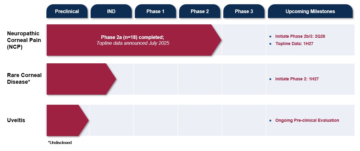 On December 11, 2025, we announced the results of further analyses of corneal images from the recently completed placebo-controlled, randomized, double-masked, Phase 2a clinical trial of urcosimod to treat patients with neuropathic corneal pain. Patients treated with 0.05% urcosimod demonstrated not only a positive reduction in neuropathic corneal pain, but also favorable changes in corneal nerve structure which were not observed in the placebo group. Data compiled from nerve growth analyses that were an exploratory endpoint in the completed 18-patient trial of urcosimod demonstrated a favorable impact on corneal nerve health. Patients treated with 0.05% urcosimod showed median increases in total nerve fiber count (+2.0, n/0.16 mm², IQR 0.54 to 3.63) and total nerve fiber length (+2.6 mm/mm², IQR 1.55 to 5.67; p = 0.057 vs placebo). In contrast, the placebo group exhibited median decreases in total nerve fiber count (–1.92, n/0.16 mm², IQR –2.79 to –0.04) and total nerve fiber length (–1.63 mm/mm², IQR –3.76 to 0.63).