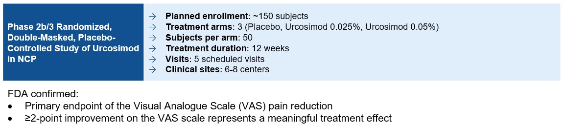 On February 9, 2024, we announced that the FDA had cleared urcosimod as its first IND application for the treatment of NCP. Notably, our initial IND submission to FDA proposed an open-label design for the clinical trial. Based on positive feedback from FDA, the Phase 2a study was amended to be a single-center, double-masked, randomized, 12-week placebo-controlled trial comparing urcosimod to placebo in NCP patients. A total of 48 patients were planned for the study, with NCP disease confirmed via confocal microscopy. The primary endpoint was designated to be the measure of VAS pain relief scores. These protocol changes would thus enable a statistically valid demonstration of a true drug effect of urcosimod on NCP symptoms.