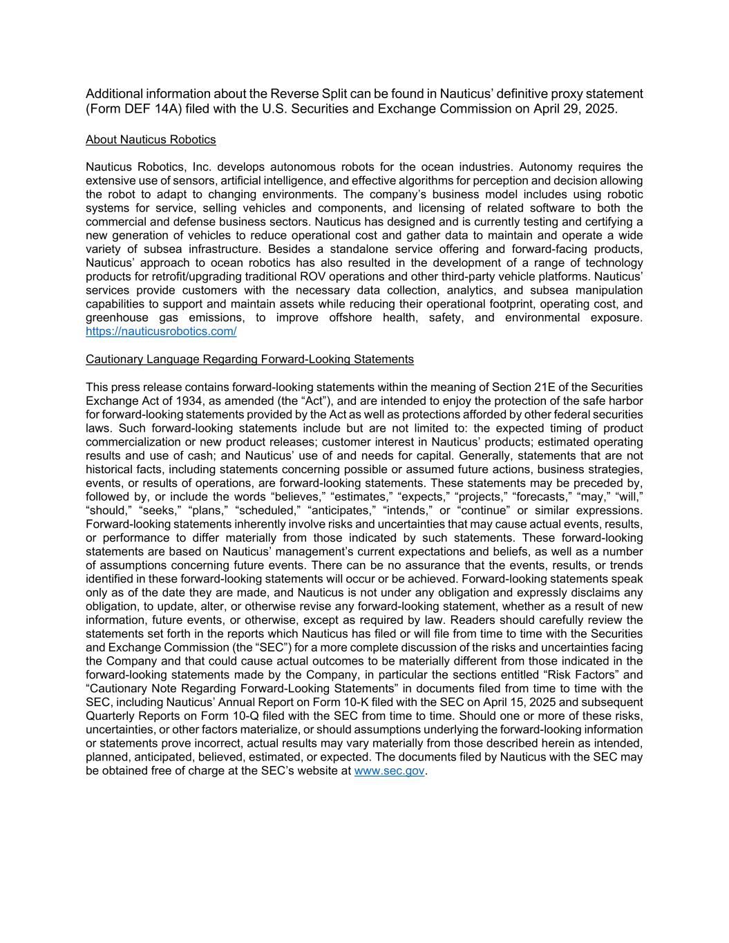 Additional information about the Reverse Split can be found in Nauticus’ definitive proxy statement (Form DEF 14A) filed with the U.S. Securities and Exchange Commission on April 29, 2025. About Nauticus Robotics Nauticus Robotics, Inc. develops autonomous robots for the ocean industries. Autonomy requires the extensive use of sensors, artificial intelligence, and effective algorithms for perception and decision allowing the robot to adapt to changing environments. The company’s business model includes using robotic systems for service, selling vehicles and components, and licensing of related software to both the commercial and defense business sectors. Nauticus has designed and is currently testing and certifying a new generation of vehicles to reduce operational cost and gather data to maintain and operate a wide variety of subsea infrastructure. Besides a standalone service offering and forward-facing products, Nauticus’ approach to ocean robotics has also resulted in the development of a range of technology products for retrofit/upgrading traditional ROV operations and other third-party vehicle platforms. Nauticus’ services provide customers with the necessary data collection, analytics, and subsea manipulation capabilities to support and maintain assets while reducing their operational footprint, operating cost, and greenhouse gas emissions, to improve offshore health, safety, and environmental exposure. https://nauticusrobotics.com/ Cautionary Language Regarding Forward-Looking Statements This press release contains forward-looking statements within the meaning of Section 21E of the Securities Exchange Act of 1934, as amended (the “Act”), and are intended to enjoy the protection of the safe harbor for forward-looking statements provided by the Act as well as protections afforded by other federal securities laws. Such forward-looking statements include but are not limited to: the expected timing of product commercialization or new product releases; customer interest in Nauticus’ products; estimated operating results and use of cash; and Nauticus’ use of and needs for capital. Generally, statements that are not historical facts, including statements concerning possible or assumed future actions, business strategies, events, or results of operations, are forward-looking statements. These statements may be preceded by, followed by, or include the words “believes,” “estimates,” “expects,” “projects,” “forecasts,” “may,” “will,” “should,” “seeks,” “plans,” “scheduled,” “anticipates,” “intends,” or “continue” or similar expressions. Forward-looking statements inherently involve risks and uncertainties that may cause actual events, results, or performance to differ materially from those indicated by such statements. These forward-looking statements are based on Nauticus’ management’s current expectations and beliefs, as well as a number of assumptions concerning future events. There can be no assurance that the events, results, or trends identified in these forward-looking statements will occur or be achieved. Forward-looking statements speak only as of the date they are made, and Nauticus is not under any obligation and expressly disclaims any obligation, to update, alter, or otherwise revise any forward-looking statement, whether as a result of new information, future events, or otherwise, except as required by law. Readers should carefully review the statements set forth in the reports which Nauticus has filed or will file from time to time with the Securities and Exchange Commission (the “SEC”) for a more complete discussion of the risks and uncertainties facing the Company and that could cause actual outcomes to be materially different from those indicated in the forward-looking statements made by the Company, in particular the sections entitled “Risk Factors” and “Cautionary Note Regarding Forward-Looking Statements” in documents filed from time to time with the SEC, including Nauticus’ Annual Report on Form 10-K filed with the SEC on April 15, 2025 and subsequent Quarterly Reports on Form 10-Q filed with the SEC from time to time. Should one or more of these risks, uncertainties, or other factors materialize, or should assumptions underlying the forward-looking information or statements prove incorrect, actual results may vary materially from those described herein as intended, planned, anticipated, believed, estimated, or expected. The documents filed by Nauticus with the SEC may be obtained free of charge at the SEC’s website at www.sec.gov.