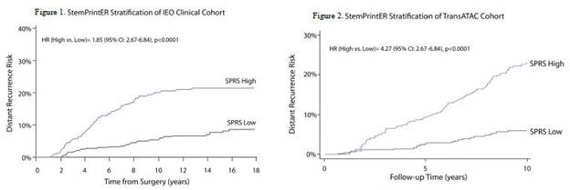 Our primary product candidate is StemPrintER, a 20-gene prognostic assay intended to predict the risk of distant recurrence (“DR”) in luminal (ER+/HER2-negative) breast cancer patients. The assay was developed to measure the “stemness” of tumors, or how much a tumor behaves like stem cells which could indicate how likely a cancer is to recur or be resistant to standard treatments, ultimately impacting how patients are managed by their multi-disciplinary care team. StemPrintER has been validated in several clinical cohorts and studies , the largest of which are a consecutive series of approximately 2,400 patients from the European Institute of Oncology (“IEO”) and approximately 800 patients from the TransATAC study. In the IEO cohort, StemPrintER High Risk patients (“SPRS High”) were 1.85 times more likely to have a distant recurrence compared to Low Risk (“SPRS Low”) patients (Figure 1) and in the TransATAC cohort, SPRS High patients were 4.27 times more likely to experience a distant recurrence compared to SPRS Low Risk patients (Figure 2). Together, these data confirm that StemPrintER is highly prognostic for outcomes in patients with breast cancer and indicate the potential utility of the test in the oncology clinic.