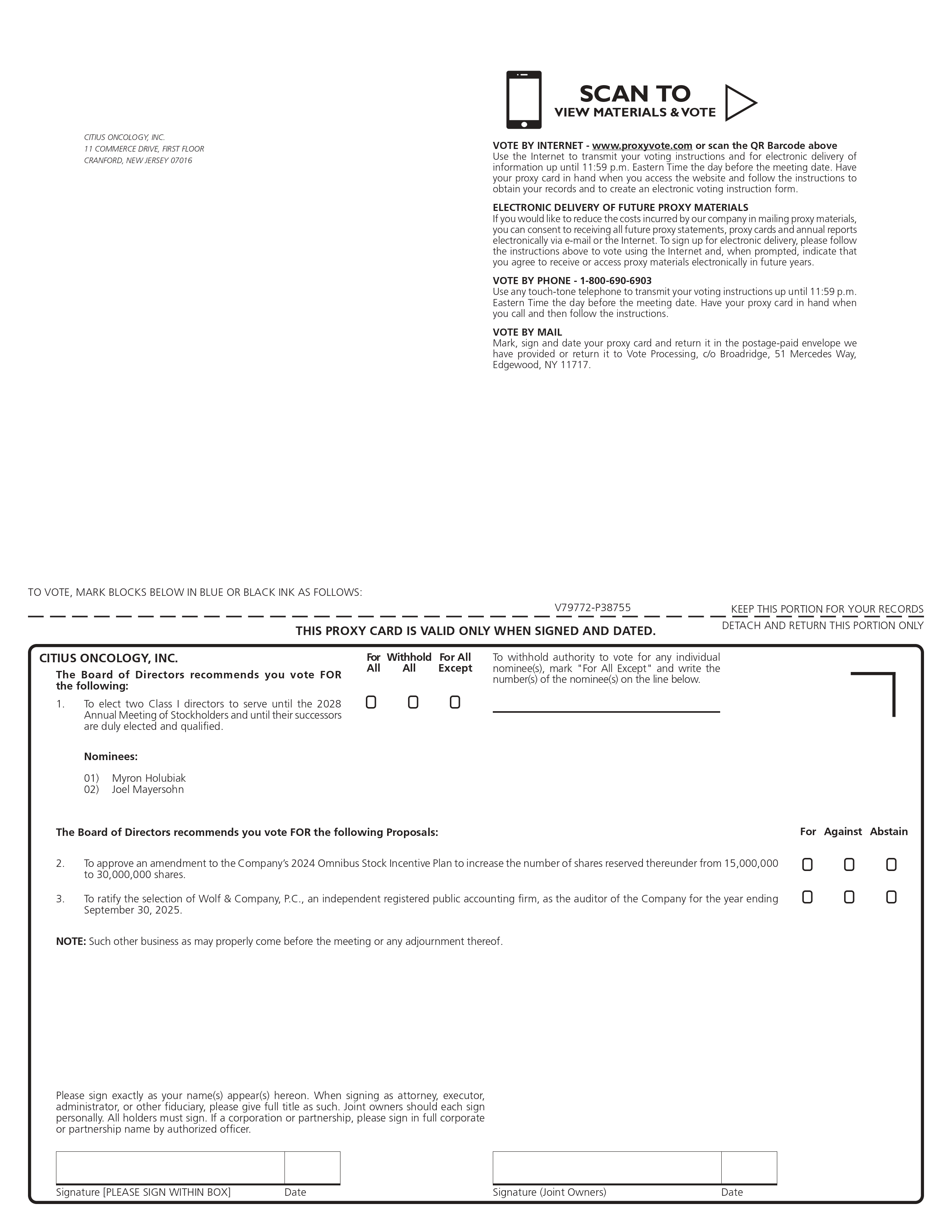 Signature [PLEASE SIGN WITHIN BOX] Date Signature (Joint Owners) Date TO VOTE, MARK BLOCKS BELOW IN BLUE OR BLACK INK AS FOLLOWS: KEEP THIS PORTION FOR YOUR RECORDS DETACH AND RETURN THIS PORTION ONLY THIS PROXY CARD IS VALID ONLY WHEN SIGNED AND DATED. V79772 - P38755 2. To approve an amendment to the Company’s 2024 Omnibus Stock Incentive Plan to increase the number of shares reserved thereunder from 15,000,000 to 30,000,000 shares. For Withhold For All All All Except O O O O O O 3. To ratify the selection of Wolf & Company, P.C., an independent registered public accounting firm, as the auditor of the Company for the year ending O O O September 30, 2025. To withhold authority to vote for any individual nominee(s), mark "For All Except" and write the number(s) of the nominee(s) on the line below . CITIUS ONCOLOGY, INC. The Board of Directors recommends you vote FOR the following: The Board of Directors recommends you vote FOR the following Proposals: Nominees: 1) Myron Holubiak 2) Joel Mayersohn CITIUS ONCOLOGY, INC. 11 COMMERCE DRIVE, FIRST FLOOR CRANFORD, NEW JERSEY 07016 NOTE: Such other business as may properly come before the meeting or any adjournment thereof. Please sign exactly as your name(s) appear(s) hereon . When signing as attorney, executor, administrator, or other fiduciary, please give full title as such . Joint owners should each sign personally . All holders must sign . If a corporation or partnership, please sign in full corporate or partnership name by authorized officer . 1 . To elect two Class I directors to serve until the 2028 Annual Meeting of Stockholders and until their successors are duly elected and qualified . For Against Abstain VOTE BY INTERNET - www.proxyvote.com or scan the QR Barcode above Use the Internet to transmit your voting instructions and for electronic delivery of information up until 11 : 59 p . m . Eastern Time the day before the meeting date . Have your proxy card in hand when you access the website and follow the instructions to obtain your records and to create an electronic voting instruction form . ELECTRONIC DELIVERY OF FUTURE PROXY MATERIALS If you would like to reduce the costs incurred by our company in mailing proxy materials, you can consent to receiving all future proxy statements, proxy cards and annual reports electronically via e - mail or the Internet . To sign up for electronic delivery, please follow the instructions above to vote using the Internet and, when prompted, indicate that you agree to receive or access proxy materials electronically in future years . VOTE BY PHONE - 1 - 800 - 690 - 6903 Use any touch - tone telephone to transmit your voting instructions up until 11 : 59 p . m . Eastern Time the day before the meeting date . Have your proxy card in hand when you call and then follow the instructions . VOTE BY MAIL Mark, sign and date your proxy card and return it in the postage - paid envelope we have provided or return it to Vote Processing, c/o Broadridge, 51 Mercedes Way, Edgewood, NY 11717 . SCAN TO VIEW MATERIALS & VOTE ڀ