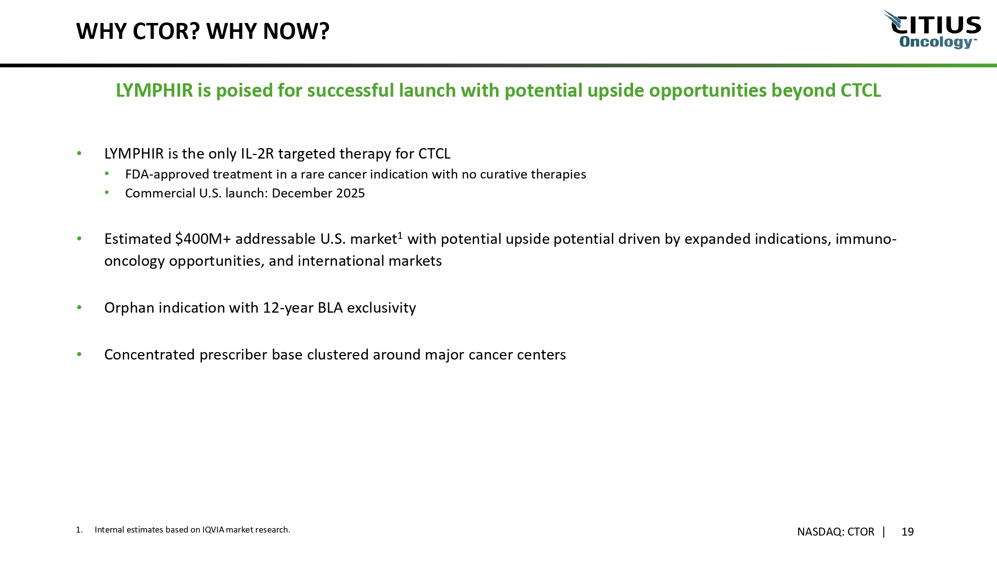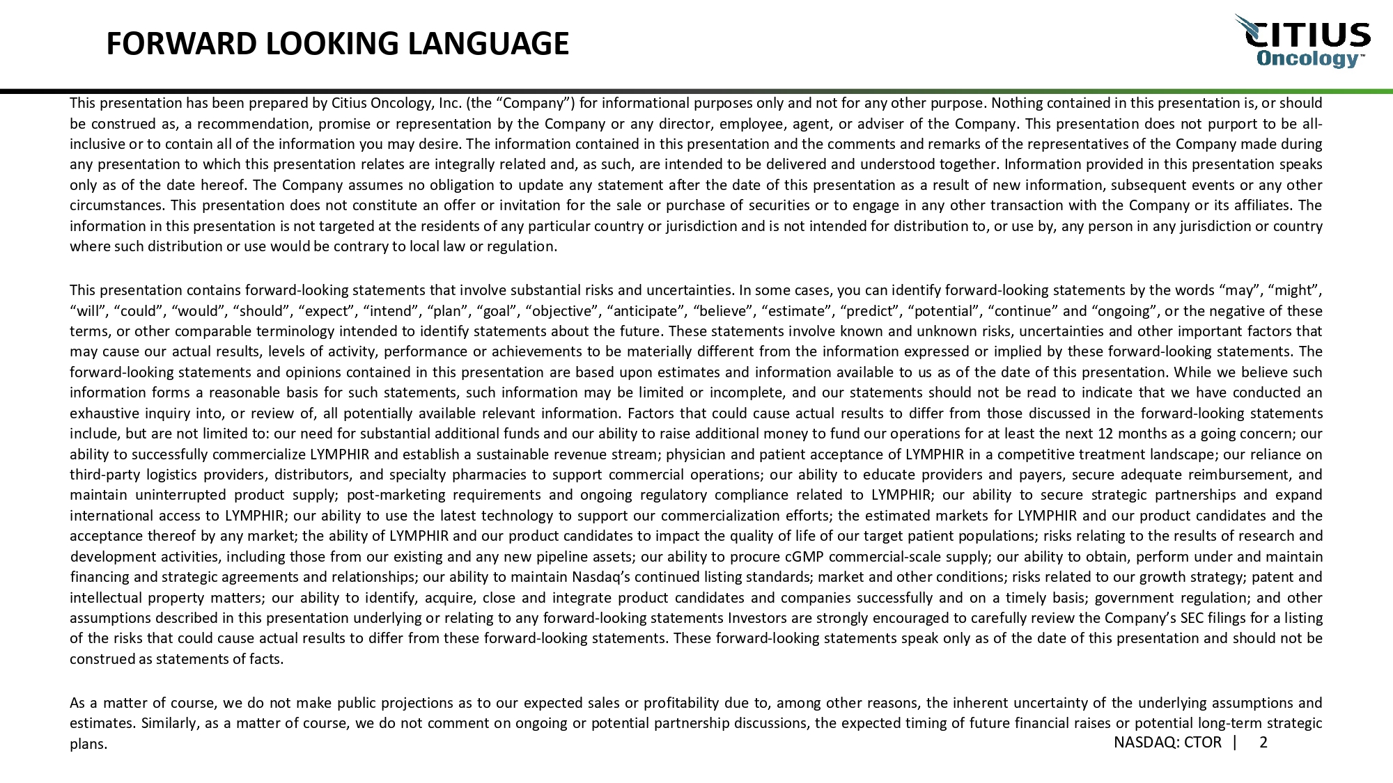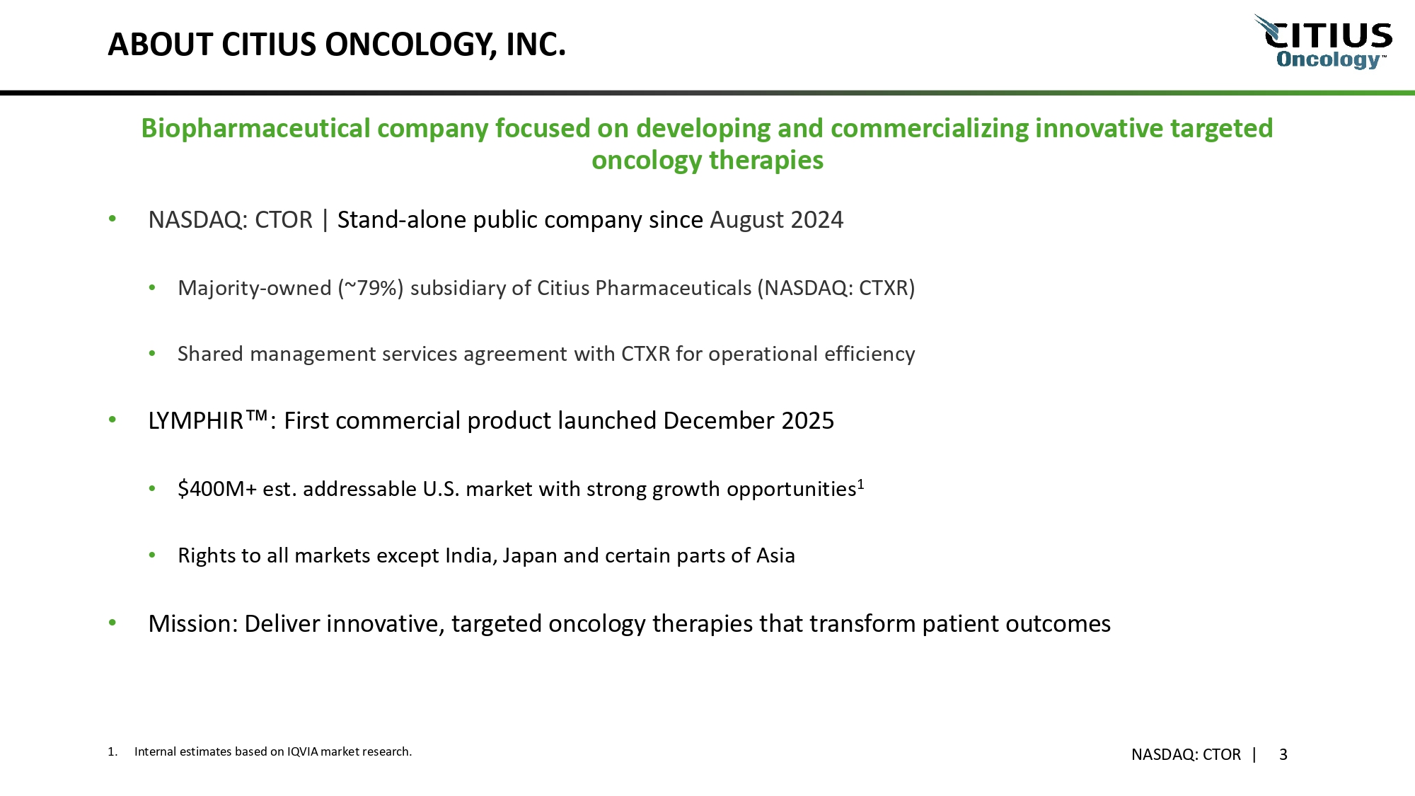 FORWARD LOOKING LANGUAGE NASDAQ: CTOR | 2 This presentation has been prepared by Citius Oncology, Inc . (the “Company”) for informational purposes only and not for any other purpose . Nothing contained in this presentation is, or should be construed as, a recommendation, promise or representation by the Company or any director, employee, agent, or adviser of the Company . This presentation does not purport to be all - inclusive or to contain all of the information you may desire . The information contained in this presentation and the comments and remarks of the representatives of the Company made during any presentation to which this presentation relates are integrally related and, as such, are intended to be delivered and understood together . Information provided in this presentation speaks only as of the date hereof . The Company assumes no obligation to update any statement after the date of this presentation as a result of new information, subsequent events or any other circumstances . This presentation does not constitute an offer or invitation for the sale or purchase of securities or to engage in any other transaction with the Company or its affiliates . The information in this presentation is not targeted at the residents of any particular country or jurisdiction and is not intended for distribution to, or use by, any person in any jurisdiction or country where such distribution or use would be contrary to local law or regulation . This presentation contains forward - looking statements that involve substantial risks and uncertainties . In some cases, you can identify forward - looking statements by the words “may”, “might”, “will”, “could”, “would”, “should”, “expect”, “intend”, “plan”, “goal”, “objective”, “anticipate”, “believe”, “estimate”, “predict”, “potential”, “continue” and “ongoing”, or the negative of these terms, or other comparable terminology intended to identify statements about the future . These statements involve known and unknown risks, uncertainties and other important factors that may cause our actual results, levels of activity, performance or achievements to be materially different from the information expressed or implied by these forward - looking statements . The forward - looking statements and opinions contained in this presentation are based upon estimates and information available to us as of the date of this presentation . While we believe such information forms a reasonable basis for such statements, such information may be limited or incomplete, and our statements should not be read to indicate that we have conducted an exhaustive inquiry into, or review of, all potentially available relevant information . Factors that could cause actual results to differ from those discussed in the forward - looking statements include, but are not limited to : our need for substantial additional funds and our ability to raise additional money to fund our operations for at least the next 12 months as a going concern ; our ability to successfully commercialize LYMPHIR and establish a sustainable revenue stream ; physician and patient acceptance of LYMPHIR in a competitive treatment landscape ; our reliance on third - party logistics providers, distributors, and specialty pharmacies to support commercial operations ; our ability to educate providers and payers, secure adequate reimbursement, and maintain uninterrupted product supply ; post - marketing requirements and ongoing regulatory compliance related to LYMPHIR ; our ability to secure strategic partnerships and expand international access to LYMPHIR ; our ability to use the latest technology to support our commercialization efforts ; the estimated markets for LYMPHIR and our product candidates and the acceptance thereof by any market ; the ability of LYMPHIR and our product candidates to impact the quality of life of our target patient populations ; risks relating to the results of research and development activities, including those from our existing and any new pipeline assets ; our ability to procure cGMP commercial - scale supply ; our ability to obtain, perform under and maintain financing and strategic agreements and relationships ; our ability to maintain Nasdaq’s continued listing standards ; market and other conditions ; risks related to our growth strategy ; patent and intellectual property matters ; our ability to identify, acquire, close and integrate product candidates and companies successfully and on a timely basis ; government regulation ; and other assumptions described in this presentation underlying or relating to any forward - looking statements Investors are strongly encouraged to carefully review the Company’s SEC filings for a listing of the risks that could cause actual results to differ from these forward - looking statements . These forward - looking statements speak only as of the date of this presentation and should not be construed as statements of facts . As a matter of course, we do not make public projections as to our expected sales or profitability due to, among other reasons, the inherent uncertainty of the underlying assumptions and estimates . Similarly, as a matter of course, we do not comment on ongoing or potential partnership discussions, the expected timing of future financial raises or potential long - term strategic plans.