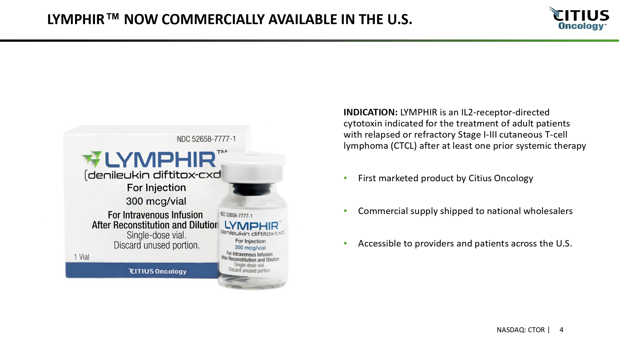 ABOUT CITIUS ONCOLOGY, INC. Biopharmaceutical company focused on developing and commercializing innovative targeted oncology therapies • NASDAQ: CTOR | Stand - alone public company since August 2024 • Majority - owned (~79%) subsidiary of Citius Pharmaceuticals (NASDAQ: CTXR) • Shared management services agreement with CTXR for operational efficiency • LYMPHIR : First commercial product launched December 2025 • $400M+ est. addressable U.S. market with strong growth opportunities 1 • Rights to all markets except India, Japan and certain parts of Asia • Mission: Deliver innovative, targeted oncology therapies that transform patient outcomes NASDAQ: CTOR | 3 1. Internal estimates based on IQVIA market research.