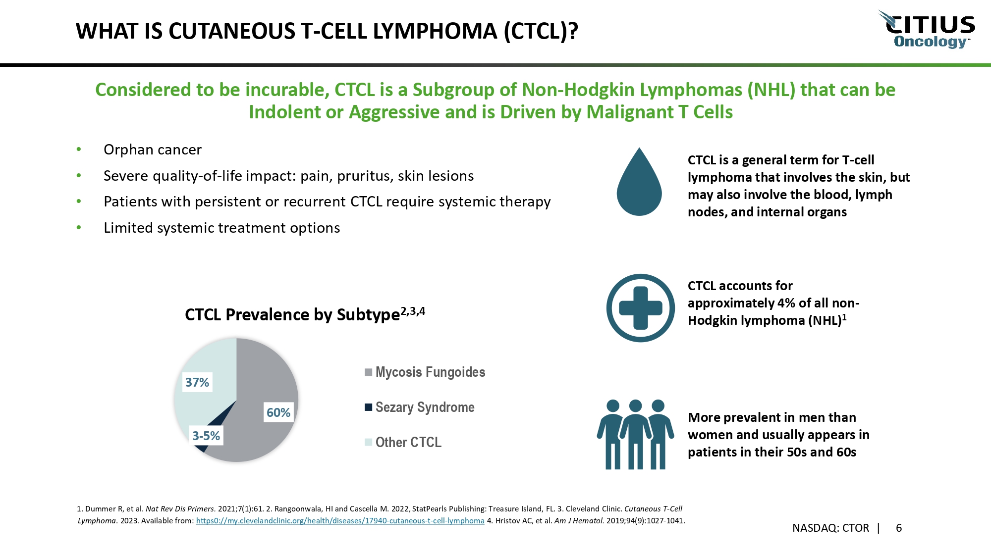 WHAT IS CUTANEOUS T - CELL LYMPHOMA (CTCL)? • Orphan cancer • Severe quality - of - life impact: pain, pruritus, skin lesions • Patients with persistent or recurrent CTCL require systemic therapy • Limited systemic treatment options Considered to be incurable, CTCL is a Subgroup of Non - Hodgkin Lymphomas (NHL) that can be Indolent or Aggressive and is Driven by Malignant T Cells CTCL is a general term for T - cell lymphoma that involves the skin, but may also involve the blood, lymph nodes, and internal organs CTCL accounts for approximately 4% of all non - Hodgkin lymphoma (NHL) 1 More prevalent in men than women and usually appears in patients in their 50s and 60s 60% 3 - 5% 37% CTCL Prevalence by Subtype 2,3,4 Mycosis Fungoides Sezary Syndrome Other CTCL NASDAQ: CTOR | 6 1. Dummer R, et al. Nat Rev Dis Primers. 2021;7(1):61. 2. Rangoonwala, HI and Cascella M. 2022, StatPearls Publishing: Treasure Island, FL. 3. Cleveland Clinic. Cutaneous T - Cell Lymphoma . 2023. Available from: https0://my.clevelandclinic.org/health/diseases/17940 - cutaneous - t - cel l - l ymphoma 4. Hristov AC, et al. Am J Hematol. 2019;94(9):1027 - 1041.