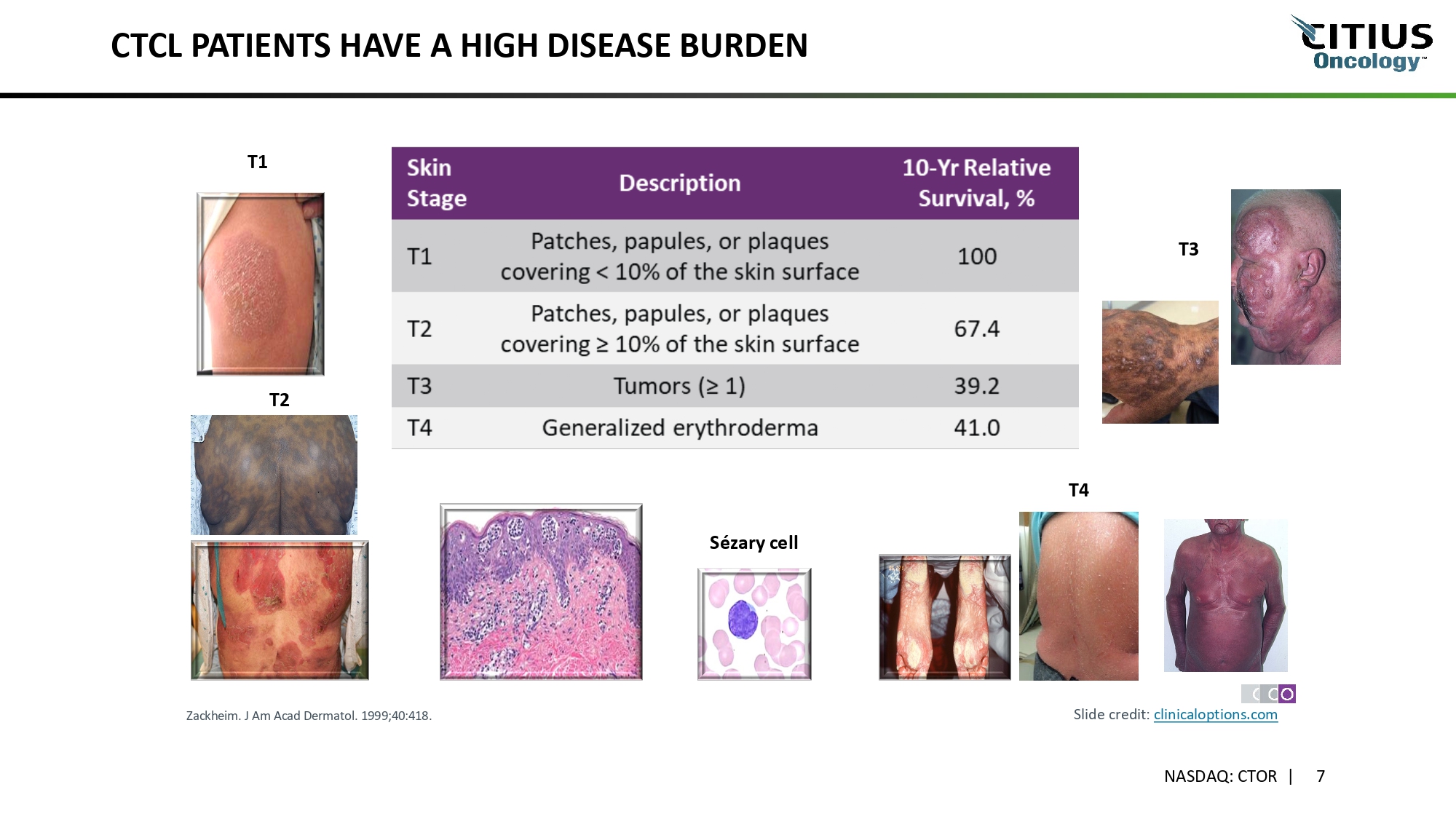 CTCL PATIENTS HAVE A HIGH DISEASE BURDEN T1 T4 Sézary cell T2 T3 Zackheim. J Am Acad Dermatol. 1999;40:418. Slide credit: clinicaloptions.com NASDAQ: CTOR | 7