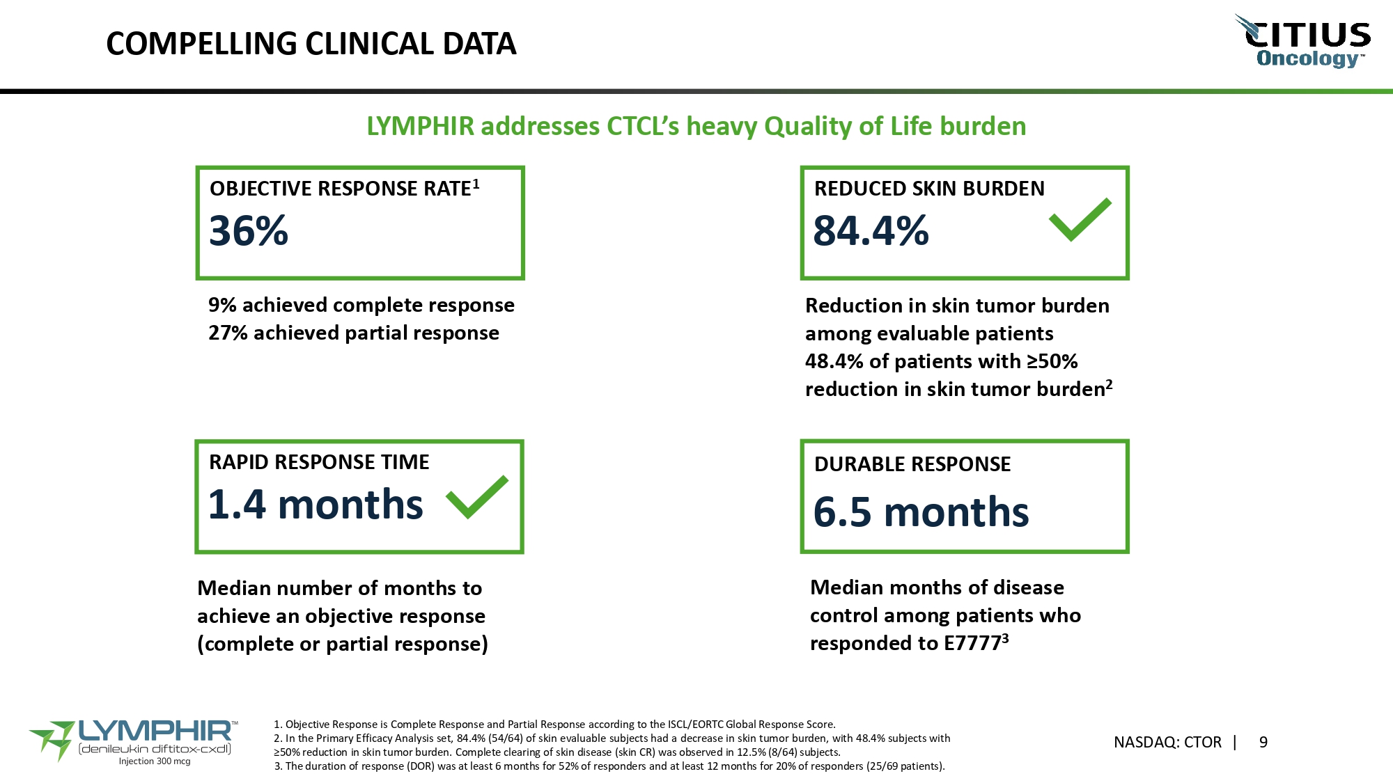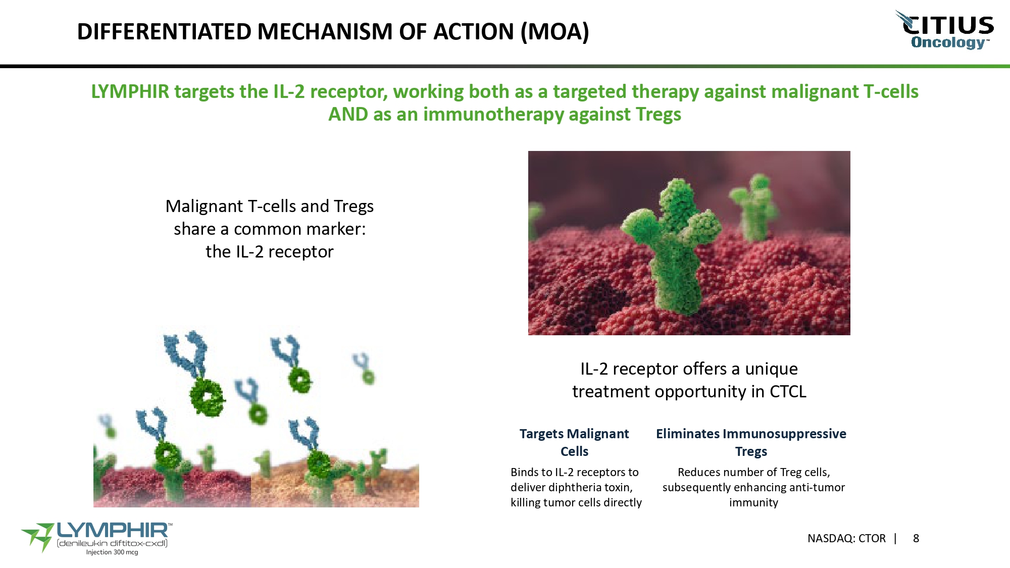 DIFFERENTIATED MECHANISM OF ACTION (MOA) LYMPHIR targets the IL - 2 receptor, working both as a targeted therapy against malignant T - cells AND as an immunotherapy against Tregs IL - 2 receptor offers a unique treatment opportunity in CTCL Malignant T - cells and Tregs share a common marker: the IL - 2 receptor Targets Malignant Cells Binds to IL - 2 receptors to deliver diphtheria toxin, killing tumor cells directly NASDAQ: CTOR | 8 Eliminates Immunosuppressive Tregs Reduces number of Treg cells, subsequently enhancing anti - tumor immunity