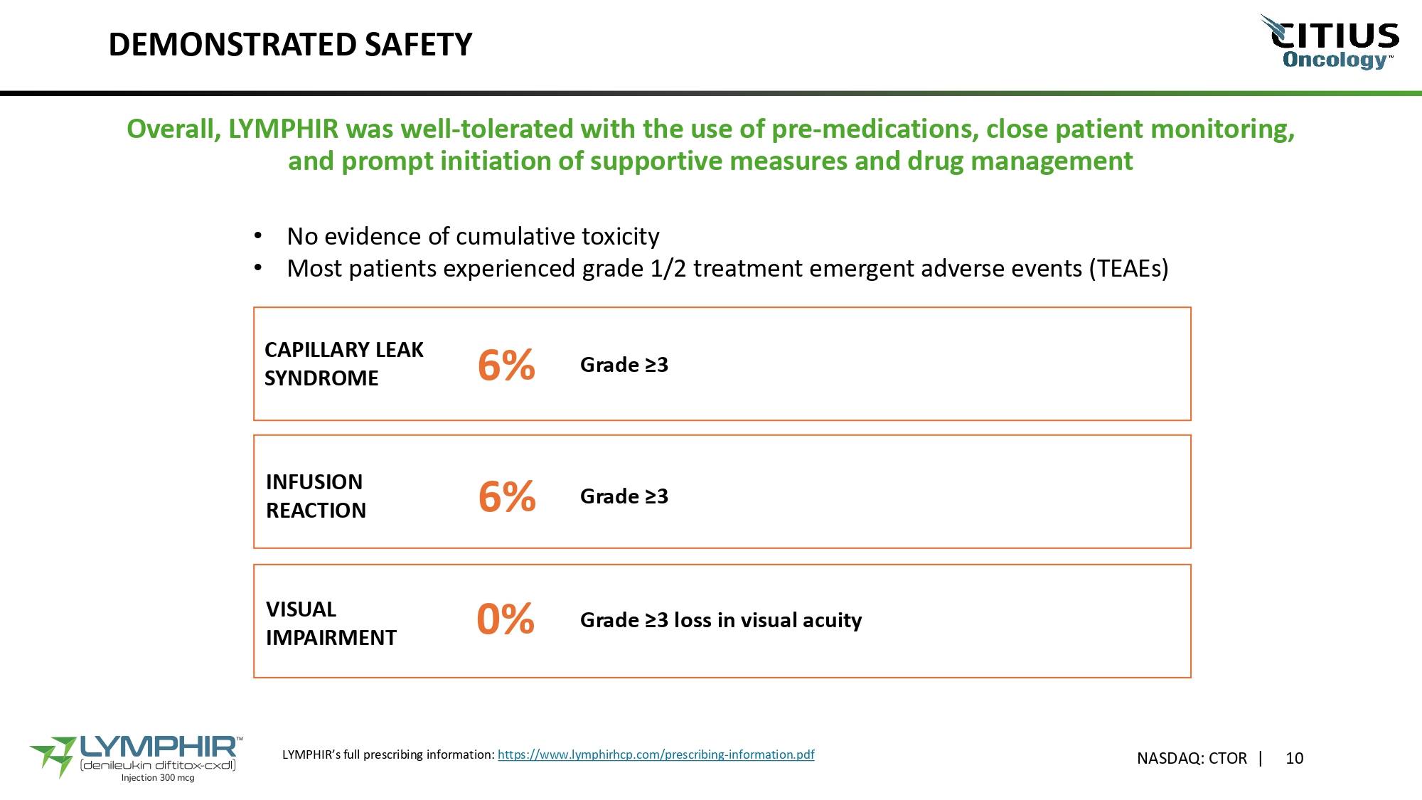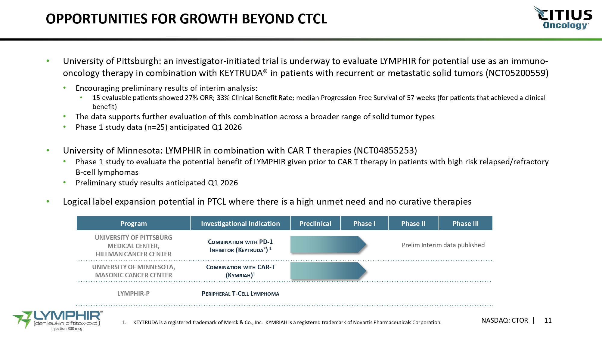 DEMONSTRATED SAFETY Overall, LYMPHIR was well - tolerated with the use of pre - medications, close patient monitoring, and prompt initiation of supportive measures and drug management • No evidence of cumulative toxicity • Most patients experienced grade 1/2 treatment emergent adverse events (TEAEs) Grade ≥3 6% CAPILLARY LEAK SYNDROME 0% Grade ≥3 loss in visual acuity VISUAL IMPAIRMENT 6% Grade ≥3 INFUSION REACTION LYMPHIR’s full prescribing information: https://www.lymphirhcp.com/prescribing - information.pdf NASDAQ: CTOR | 10