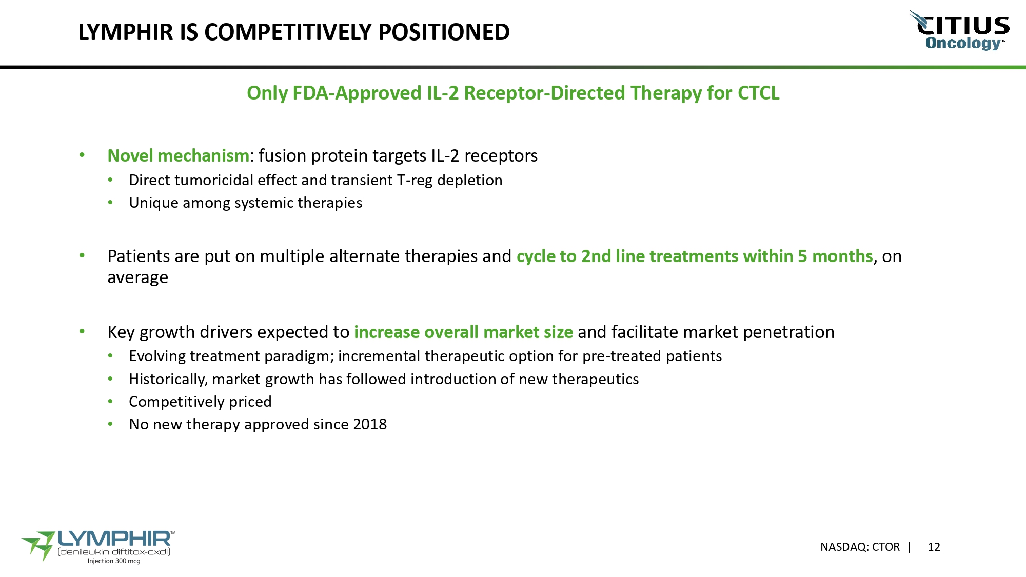 OPPORTUNITIES FOR GROWTH BEYOND CTCL • University of Pittsburgh: an investigator - initiated trial is underway to evaluate LYMPHIR for potential use as an immuno - oncology therapy in combination with KEYTRUDA® in patients with recurrent or metastatic solid tumors (NCT05200559) • Encouraging preliminary results of interim analysis: • 15 evaluable patients showed 27% ORR; 33% Clinical Benefit Rate; median Progression Free Survival of 57 weeks (for patients that achieved a clinical benefit) • The data supports further evaluation of this combination across a broader range of solid tumor types • Phase 1 study data (n=25) anticipated Q1 2026 • University of Minnesota: LYMPHIR in combination with CAR T therapies (NCT04855253) • Phase 1 study to evaluate the potential benefit of LYMPHIR given prior to CAR T therapy in patients with high risk relapsed/refractory B - cell lymphomas • Preliminary study results anticipated Q1 2026 • Logical label expansion potential in PTCL where there is a high unmet need and no curative therapies Phase III Phase II Phase I Preclinical Investigational Indication Program data published Prelim Interim p C OMBINATION WITH PD - 1 I NHIBITOR (K EYTRUDA ® ) 1 UNIVERSITY OF PITTSBURG MEDICAL CENTER, HILLMAN CANCER CENTER C OMBINATION WITH CAR - T (K YMRIAH ) 1 UNIVERSITY OF MINNESOTA, MASONIC CANCER CENTER P ERIPHERAL T - C ELL L YMPHOMA LYMPHIR - P NASDAQ: CTOR | 11 1. KEYTRUDA is a registered trademark of Merck & Co., Inc. KYMRIAH is a registered trademark of Novartis Pharmaceuticals Corporation.