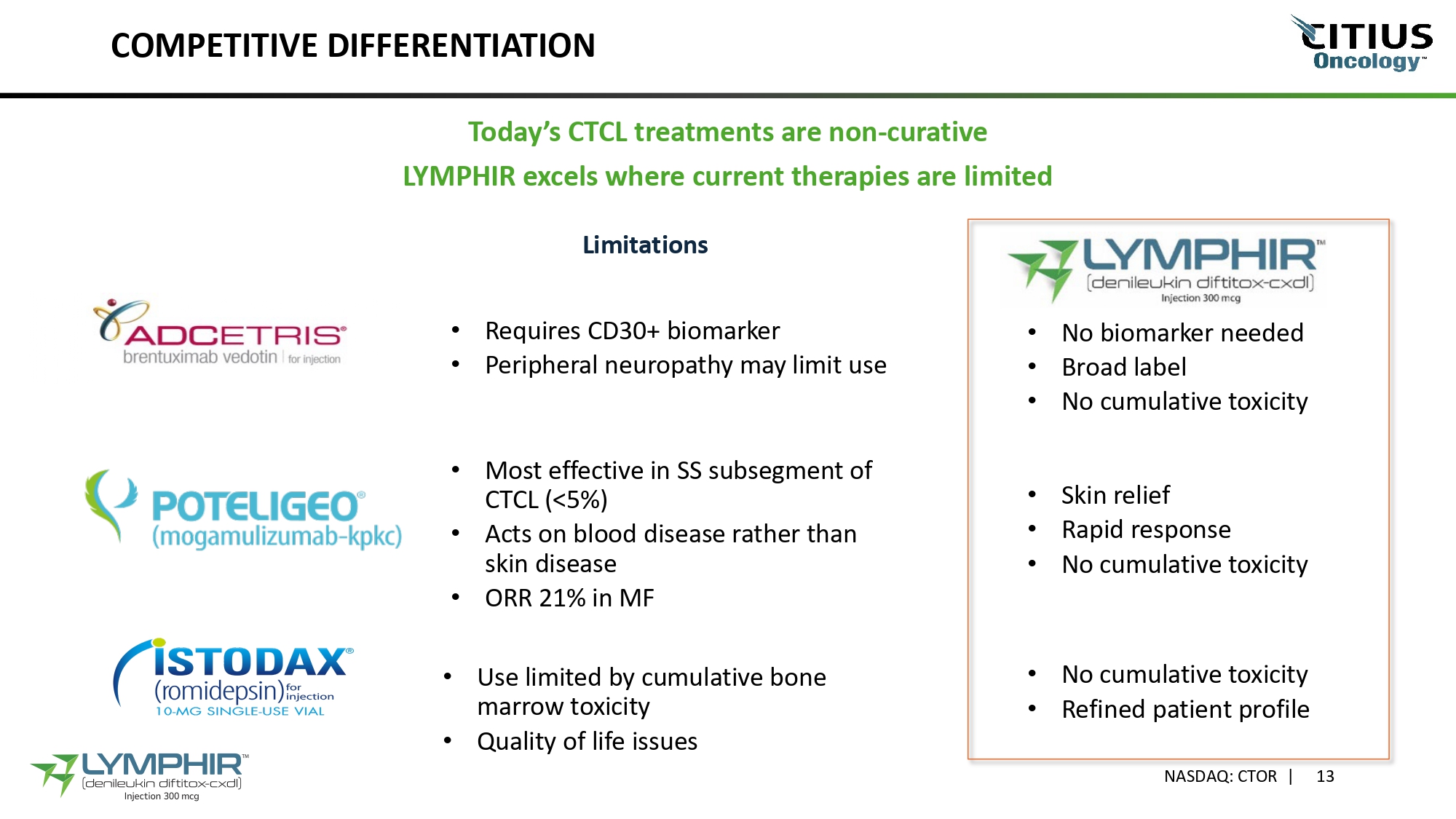 LYMPHIR IS COMPETITIVELY POSITIONED NASDAQ: CTOR | 12 Only FDA - Approved IL - 2 Receptor - Directed Therapy for CTCL • Novel mechanism : fusion protein targets IL - 2 receptors • Direct tumoricidal effect and transient T - reg depletion • Unique among systemic therapies • Patients are put on multiple alternate therapies and cycle to 2nd line treatments within 5 months , on average • Key growth drivers expected to increase overall market size and facilitate market penetration • Evolving treatment paradigm; incremental therapeutic option for pre - treated patients • Historically, market growth has followed introduction of new therapeutics • Competitively priced • No new therapy approved since 2018