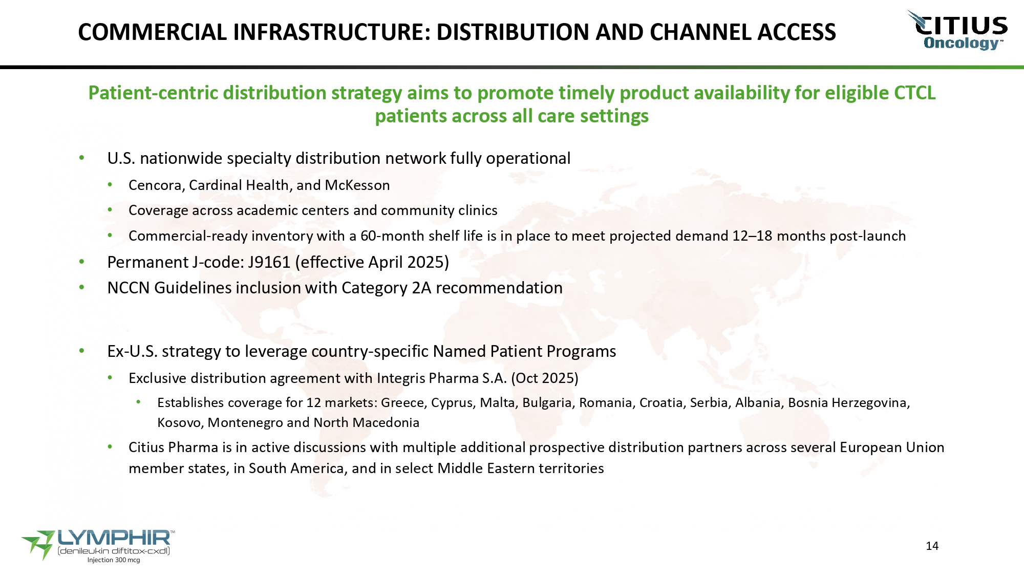 COMMERCIAL INFRASTRUCTURE: DISTRIBUTION AND CHANNEL ACCESS 14 Patient - centric distribution strategy aims to promote timely product availability for eligible CTCL patients across all care settings • U.S. nationwide specialty distribution network fully operational • Cencora, Cardinal Health, and McKesson • Coverage across academic centers and community clinics • Commercial - ready inventory with a 60 - month shelf life is in place to meet projected demand 12 – 18 months post - launch • Permanent J - code: J9161 (effective April 2025) • NCCN Guidelines inclusion with Category 2A recommendation • Ex - U.S. strategy to leverage country - specific Named Patient Programs • Exclusive distribution agreement with Integris Pharma S.A. (Oct 2025) • Establishes coverage for 12 markets: Greece, Cyprus, Malta, Bulgaria, Romania, Croatia, Serbia, Albania, Bosnia Herzegovina, Kosovo, Montenegro and North Macedonia • Citius Pharma is in active discussions with multiple additional prospective distribution partners across several European Union member states, in South America, and in select Middle Eastern territories