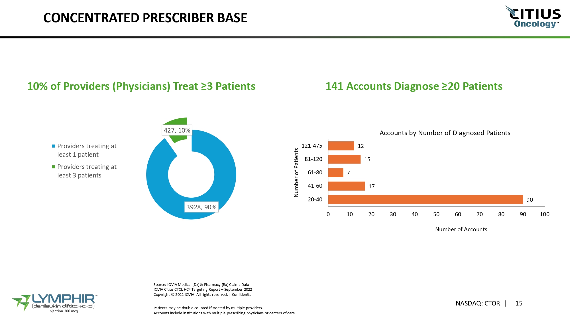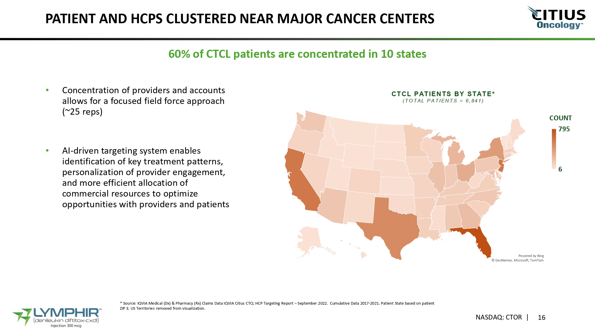 CONCENTRATED PRESCRIBER BASE NASDAQ: CTOR | 15 10% of Providers (Physicians) Treat ≥3 Patients 90 17 7 15 12 0 10 20 30 40 50 60 70 Number of Accounts 80 90 100 20 - 40 41 - 60 61 - 80 81 - 120 121 - 475 Number of Patients Accounts by Number of Diagnosed Patients Source: IQVIA Medical (Dx) & Pharmacy (Rx) Claims Data IQVIA Citius CTCL HCP Targeting Report – September 2022 Copyright © 2022 IQVIA. All rights reserved. | Confidential Patients may be double counted if treated by multiple providers. Accounts include institutions with multiple prescribing physicians or centers of care. 3928, 90% 427, 10% Providers treating at least 1 patient Providers treating at least 3 patients 141 Accounts Diagnose ≥20 Patients
