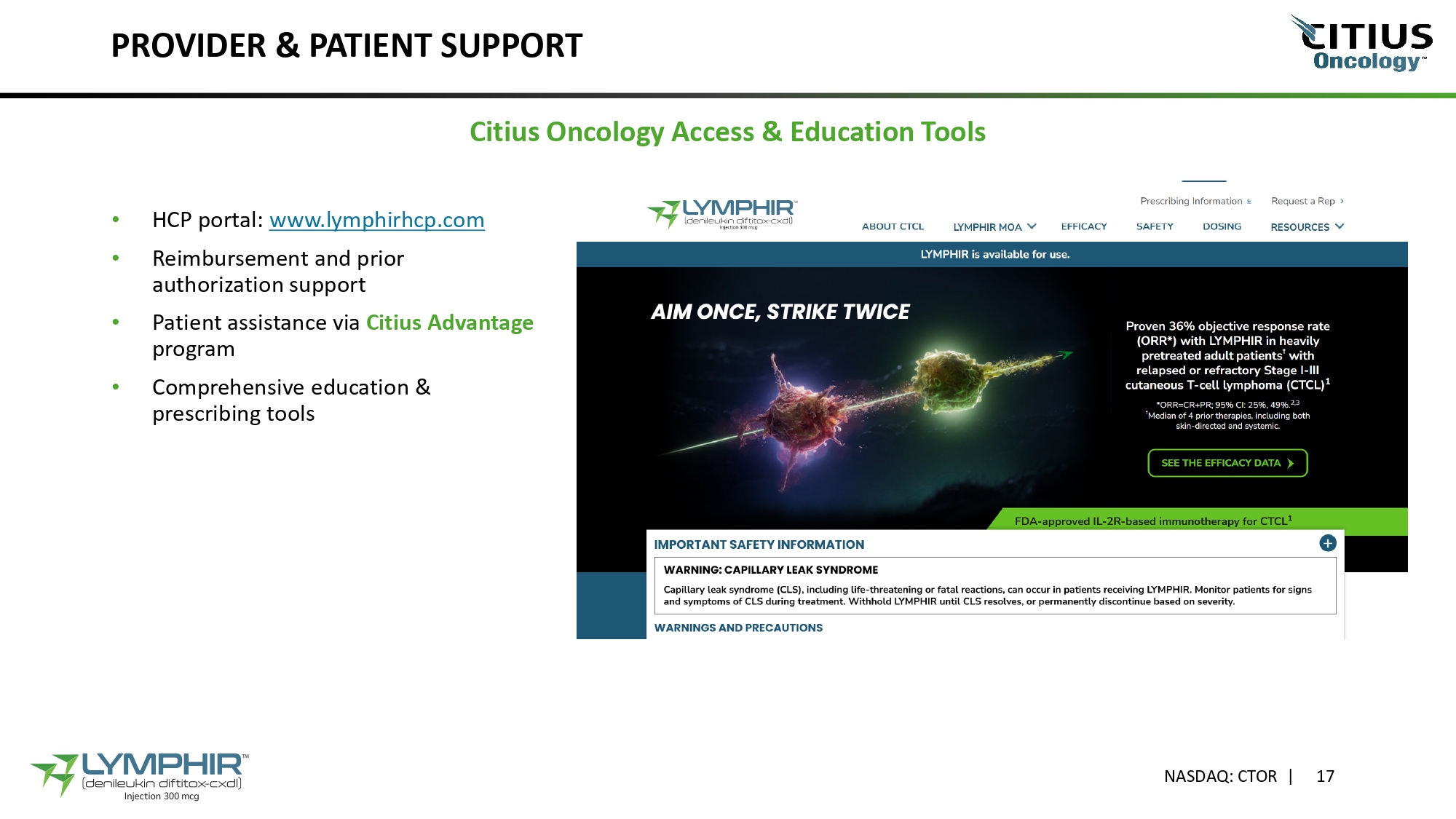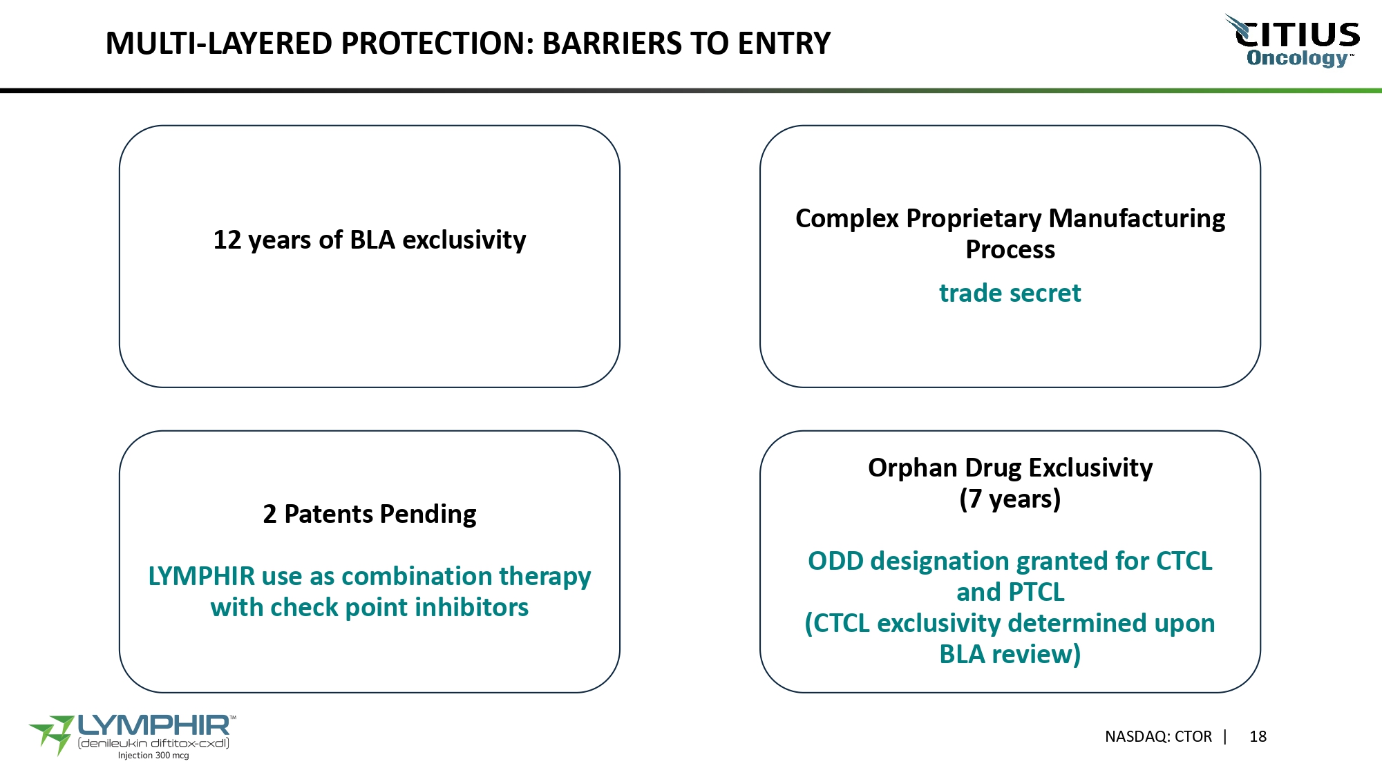 PROVIDER & PATIENT SUPPORT Citius Oncology Access & Education Tools • HCP portal: www.lymphirhcp.com • Reimbursement and prior authorization support • Patient assistance via Citius Advantage program • Comprehensive education & prescribing tools NASDAQ: CTOR | 17