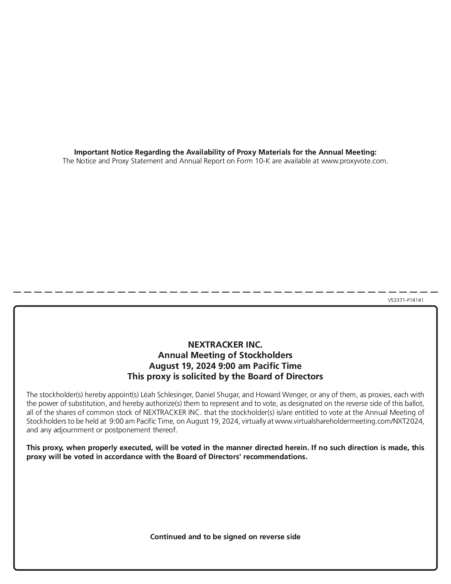 ![]()  |  |  | To approve an amendment and restatement of the Second Amended and Restated 2022 Nextracker Inc. Equity Incentive Plan to increase the number of shares authorized for issuance thereunder by 11,100,000 shares.  |