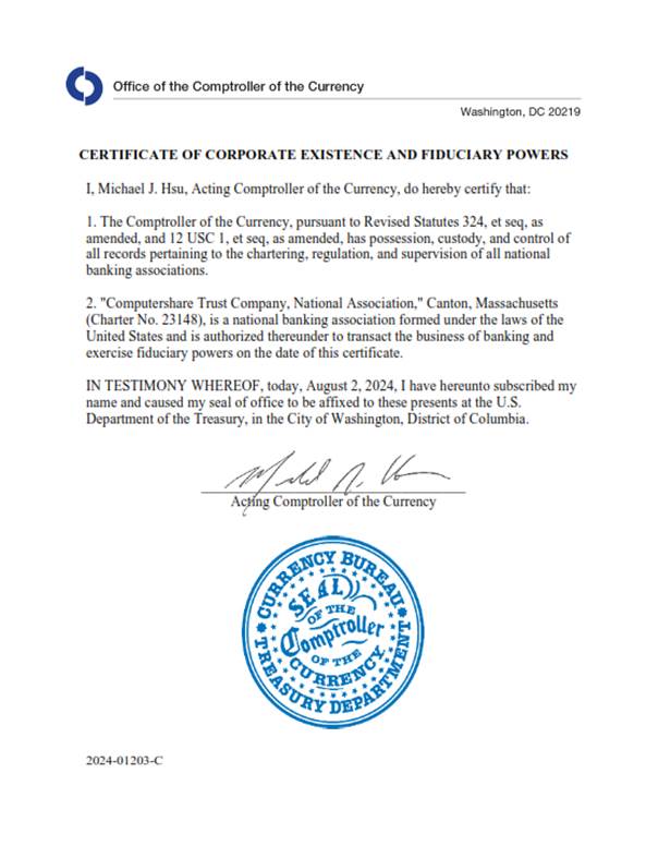 A copy of the Comptroller of the Currency Certification of Fiduciary Powers for Computershare Trust Company, National Association, dated August 2, 2024.