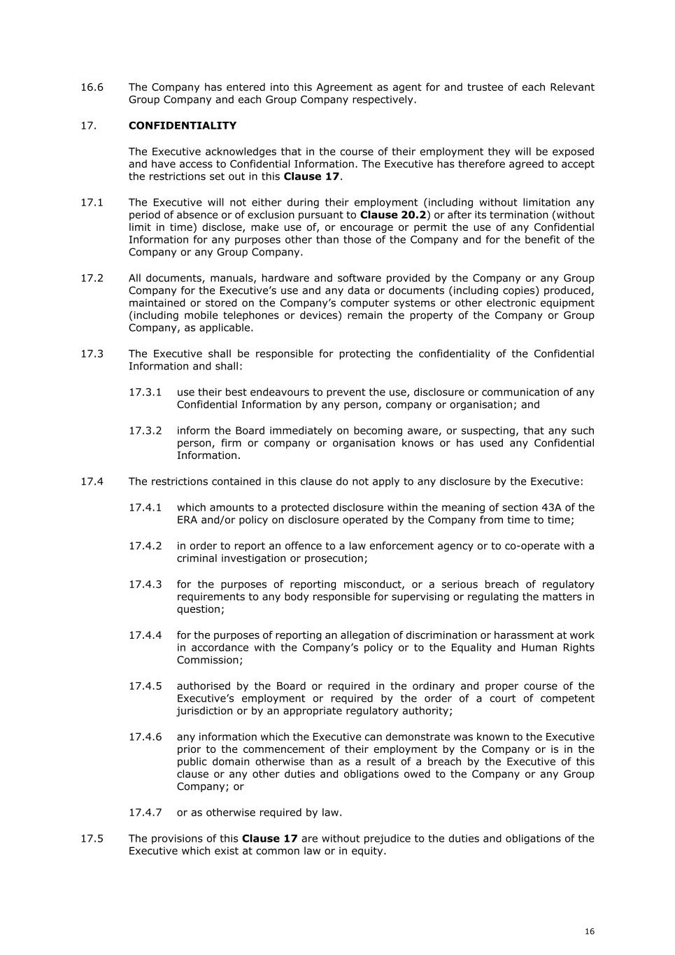 16 16.6 The Company has entered into this Agreement as agent for and trustee of each Relevant Group Company and each Group Company respectively. 17. CONFIDENTIALITY The Executive acknowledges that in the course of their employment they will be exposed and have access to Confidential Information. The Executive has therefore agreed to accept the restrictions set out in this Clause 17. 17.1 The Executive will not either during their employment (including without limitation any period of absence or of exclusion pursuant to Clause 20.2) or after its termination (without limit in time) disclose, make use of, or encourage or permit the use of any Confidential Information for any purposes other than those of the Company and for the benefit of the Company or any Group Company. 17.2 All documents, manuals, hardware and software provided by the Company or any Group Company for the Executive’s use and any data or documents (including copies) produced, maintained or stored on the Company’s computer systems or other electronic equipment (including mobile telephones or devices) remain the property of the Company or Group Company, as applicable. 17.3 The Executive shall be responsible for protecting the confidentiality of the Confidential Information and shall: 17.3.1 use their best endeavours to prevent the use, disclosure or communication of any Confidential Information by any person, company or organisation; and 17.3.2 inform the Board immediately on becoming aware, or suspecting, that any such person, firm or company or organisation knows or has used any Confidential Information. 17.4 The restrictions contained in this clause do not apply to any disclosure by the Executive: 17.4.1 which amounts to a protected disclosure within the meaning of section 43A of the ERA and/or policy on disclosure operated by the Company from time to time; 17.4.2 in order to report an offence to a law enforcement agency or to co-operate with a criminal investigation or prosecution; 17.4.3 for the purposes of reporting misconduct, or a serious breach of regulatory requirements to any body responsible for supervising or regulating the matters in question; 17.4.4 for the purposes of reporting an allegation of discrimination or harassment at work in accordance with the Company’s policy or to the Equality and Human Rights Commission; 17.4.5 authorised by the Board or required in the ordinary and proper course of the Executive’s employment or required by the order of a court of competent jurisdiction or by an appropriate regulatory authority; 17.4.6 any information which the Executive can demonstrate was known to the Executive prior to the commencement of their employment by the Company or is in the public domain otherwise than as a result of a breach by the Executive of this clause or any other duties and obligations owed to the Company or any Group Company; or 17.4.7 or as otherwise required by law. 17.5 The provisions of this Clause 17 are without prejudice to the duties and obligations of the Executive which exist at common law or in equity.