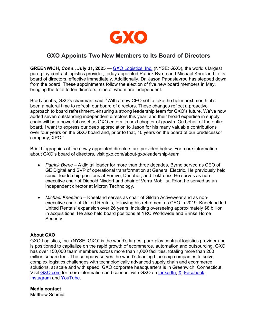 GXO Appoints Two New Members to Its Board of Directors GREENWICH, Conn., July 31, 2025 — GXO Logistics, Inc. (NYSE: GXO), the world’s largest pure-play contract logistics provider, today appointed Patrick Byrne and Michael Kneeland to its board of directors, effective immediately. Additionally, Dr. Jason Papastavrou has stepped down from the board. These appointments follow the election of five new board members in May, bringing the total to ten directors, nine of whom are independent. Brad Jacobs, GXO’s chairman, said, “With a new CEO set to take the helm next month, it’s been a natural time to refresh our board of directors. These changes reflect a proactive approach to board refreshment, ensuring a strong leadership team for GXO’s future. We’ve now added seven outstanding independent directors this year, and their broad expertise in supply chain will be a powerful asset as GXO enters its next chapter of growth. On behalf of the entire board, I want to express our deep appreciation to Jason for his many valuable contributions over four years on the GXO board and, prior to that, 10 years on the board of our predecessor company, XPO.” Brief biographies of the newly appointed directors are provided below. For more information about GXO’s board of directors, visit gxo.com/about-gxo/leadership-team. • Patrick Byrne – A digital leader for more than three decades, Byrne served as CEO of GE Digital and SVP of operational transformation at General Electric. He previously held senior leadership positions at Fortive, Danaher, and Tektronix. He serves as non- executive chair of Diebold Nixdorf and chair of Verra Mobility. Prior, he served as an independent director at Micron Technology. • Michael Kneeland – Kneeland serves as chair of Gildan Activewear and as non- executive chair of United Rentals, following his retirement as CEO in 2019. Kneeland led United Rentals’ expansion over 26 years, including overseeing approximately $8 billion in acquisitions. He also held board positions at YRC Worldwide and Brinks Home Security. About GXO GXO Logistics, Inc. (NYSE: GXO) is the world’s largest pure-play contract logistics provider and is positioned to capitalize on the rapid growth of ecommerce, automation and outsourcing. GXO has over 150,000 team members across more than 1,000 facilities, totaling more than 200 million square feet. The company serves the world’s leading blue-chip companies to solve complex logistics challenges with technologically advanced supply chain and ecommerce solutions, at scale and with speed. GXO corporate headquarters is in Greenwich, Connecticut. Visit GXO.com for more information and connect with GXO on LinkedIn, X, Facebook, Instagram and YouTube. Media contact Matthew Schmidt