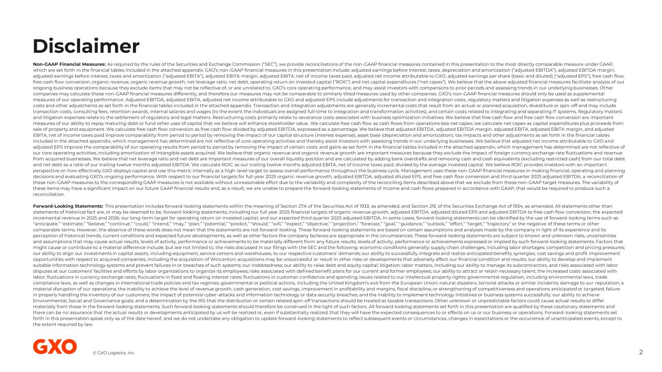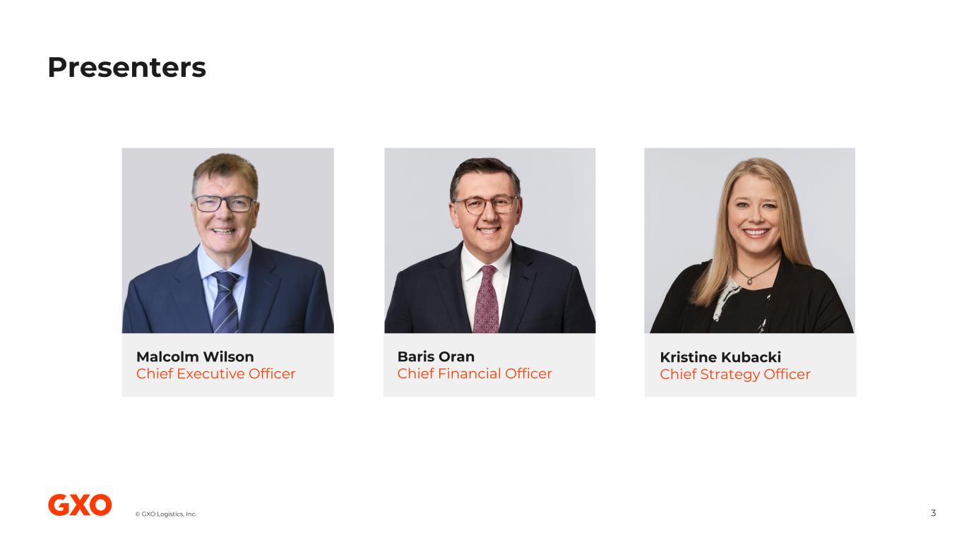 © GXO Logistics, Inc. Disclaimer 2 Non-GAAP Financial Measures: As required by the rules of the Securities and Exchange Commission (“SEC”), we provide reconciliations of the non-GAAP financial measures contained in this presentation to the most directly comparable measure under GAAP, which are set forth in the financial tables included in the attached appendix. GXO’s non-GAAP financial measures in this presentation include: adjusted earnings before interest, taxes, depreciation and amortization (“adjusted EBITDA”), adjusted EBITDA margin, adjusted earnings before interest, taxes and amortization (“adjusted EBITA”), adjusted EBITA margin, adjusted EBITA, net of income taxes paid, adjusted net income attributable to GXO, adjusted earnings per share (basic and diluted) (“adjusted EPS”), free cash flow, free cash flow conversion, organic revenue, organic revenue growth, net leverage ratio, net debt, operating return on invested capital (“ROIC”) and net capital expenditures (“net capex”). We believe that the above adjusted financial measures facilitate analysis of our ongoing business operations because they exclude items that may not be reflective of, or are unrelated to, GXO’s core operating performance, and may assist investors with comparisons to prior periods and assessing trends in our underlying businesses. Other companies may calculate these non-GAAP financial measures differently, and therefore our measures may not be comparable to similarly titled measures used by other companies. GXO’s non-GAAP financial measures should only be used as supplemental measures of our operating performance. Adjusted EBITDA, adjusted EBITA, adjusted net income attributable to GXO and adjusted EPS include adjustments for transaction and integration costs, regulatory matters and litigation expenses as well as restructuring costs and other adjustments as set forth in the financial tables included in the attached appendix. Transaction and integration adjustments are generally incremental costs that result from an actual or planned acquisition, divestiture or spin-off and may include transaction costs, consulting fees, retention awards, internal salaries and wages (to the extent the individuals are assigned full-time to integration and transformation activities), and certain costs related to integrating and separating IT systems. Regulatory matters and litigation expenses relate to the settlement of regulatory and legal matters. Restructuring costs primarily relate to severance costs associated with business optimization initiatives. We believe that free cash flow and free cash flow conversion are important measures of our ability to repay maturing debt or fund other uses of capital that we believe will enhance stockholder value. We calculate free cash flow as cash flows from operations less net capex; we calculate net capex as capital expenditures plus proceeds from sale of property and equipment. We calculate free cash flow conversion as free cash flow divided by adjusted EBITDA, expressed as a percentage. We believe that adjusted EBITDA, adjusted EBITDA margin, adjusted EBITA, adjusted EBITA margin, and adjusted EBITA, net of income taxes paid improve comparability from period to period by removing the impact of our capital structure (interest expense), asset base (depreciation and amortization), tax impacts and other adjustments as set forth in the financial tables included in the attached appendix, which management has determined are not reflective of core operating activities and thereby assist investors with assessing trends in our underlying businesses. We believe that adjusted net income attributable to GXO and adjusted EPS improve the comparability of our operating results from period to period by removing the impact of certain costs and gains as set forth in the financial tables included in the attached appendix, which management has determined are not reflective of our core operating activities, including amortization of intangible assets acquired. We believe that organic revenue and organic revenue growth are important measures because they exclude the impact of foreign currency exchange rate fluctuations and revenue from acquired businesses. We believe that net leverage ratio and net debt are important measures of our overall liquidity position and are calculated by adding bank overdrafts and removing cash and cash equivalents (excluding restricted cash) from our total debt and net debt as a ratio of our trailing twelve months adjusted EBITDA. We calculate ROIC as our trailing twelve months adjusted EBITA, net of income taxes paid, divided by the average invested capital. We believe ROIC provides investors with an important perspective on how effectively GXO deploys capital and use this metric internally as a high-level target to assess overall performance throughout the business cycle. Management uses these non-GAAP financial measures in making financial, operating and planning decisions and evaluating GXO’s ongoing performance. With respect to our financial targets for full-year 2025 organic revenue growth, adjusted EBITDA, adjusted diluted EPS, and free cash flow conversion and third quarter 2025 adjusted EBITDA, a reconciliation of these non-GAAP measures to the corresponding GAAP measures is not available without unreasonable effort due to the variability and complexity of the reconciling items described above that we exclude from these non-GAAP target measures. The variability of these items may have a significant impact on our future GAAP financial results and, as a result, we are unable to prepare the forward-looking statements of income and cash flows prepared in accordance with GAAP, that would be required to produce such a reconciliation. Forward-Looking Statements: This presentation includes forward-looking statements within the meaning of Section 27A of the Securities Act of 1933, as amended, and Section 21E of the Securities Exchange Act of 1934, a