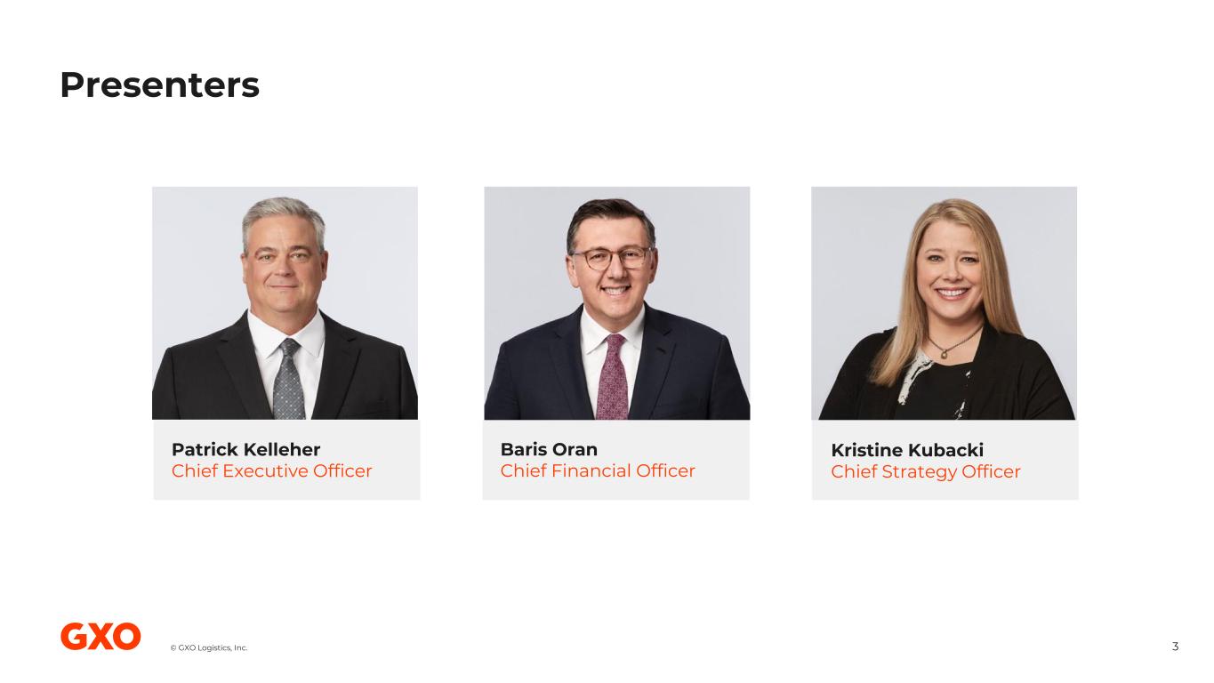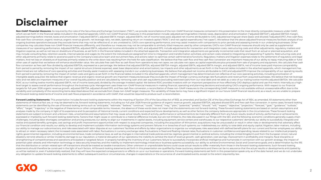 © GXO Logistics, Inc. Disclaimer 2 Non-GAAP Financial Measures: As required by the rules of the Securities and Exchange Commission (“SEC”), we provide reconciliations of the non-GAAP financial measures contained in this presentation to the most directly comparable measure under GAAP, which are set forth in the financial tables included in the attached appendix. GXO’s non-GAAP financial measures in this presentation include: adjusted earnings before interest, taxes, depreciation and amortization (“adjusted EBITDA”), adjusted EBITDA margin, adjusted earnings before interest, taxes and amortization (“adjusted EBITA”), adjusted EBITA margin, adjusted EBITA, net of income taxes paid, adjusted net income attributable to GXO, adjusted earnings per share (basic and diluted) (“adjusted EPS”), free cash flow, free cash flow conversion, organic revenue, organic revenue growth, net leverage ratio, net debt, operating return on invested capital (“ROIC”) and net capital expenditures (“net capex”). We believe that the above adjusted financial measures facilitate analysis of our ongoing business operations because they exclude items that may not be reflective of, or are unrelated to, GXO’s core operating performance, and may assist investors with comparisons to prior periods and assessing trends in our underlying businesses. Other companies may calculate these non-GAAP financial measures differently, and therefore our measures may not be comparable to similarly titled measures used by other companies. GXO’s non-GAAP financial measures should only be used as supplemental measures of our operating performance. Adjusted EBITDA, adjusted EBITA, adjusted net income attributable to GXO, and adjusted EPS, include adjustments for transaction and integration costs, restructuring costs and other adjustments, regulatory matters and litigation expense, as well as net loss on divestiture of business, as set forth in the financial tables included in the attached appendix. Transaction and integration adjustments are generally incremental costs that result from an actual or planned acquisition, and may include consulting fees, retention awards, internal salaries and wages (to the extent the individuals are assigned full-time to integration and transformation activities), and certain costs related to integrating and separating IT systems. Restructuring costs and other adjustments primarily relate to severance paid to the Company’s executive team and recruitment fees, and actions taken to optimize certain administrative functions. Regulatory matters and litigation expenses relate to the settlement of regulatory and legal matters. And net loss on divestiture of business primarily relates to the write-down loss resulting from the held-for-sale classification. We believe that free cash flow and free cash flow conversion are important measures of our ability to repay maturing debt or fund other uses of capital that we believe will enhance stockholder value. We calculate free cash flow as cash flows from operations less net capex; we calculate net capex as capital expenditures plus proceeds from sale of property and equipment. We calculate free cash flow conversion as free cash flow divided by adjusted EBITDA, expressed as a percentage. We believe that adjusted EBITDA, adjusted EBITDA margin, adjusted EBITA, adjusted EBITA margin, and adjusted EBITA, net of income taxes paid improve comparability from period to period by removing the impact of our capital structure (interest expense), asset base (depreciation and amortization), tax impacts and other adjustments as set forth in the financial tables included in the attached appendix, which management has determined are not reflective of core operating activities and thereby assist investors with assessing trends in our underlying businesses. We believe that adjusted net income attributable to GXO and adjusted EPS improve the comparability of our operating results from period to period by removing the impact of certain costs and gains as set forth in the financial tables included in the attached appendix, which management has determined are not reflective of our core operating activities, including amortization of intangible assets acquired. We believe that organic revenue and organic revenue growth are important measures because they exclude the impact of foreign currency exchange rate fluctuations and revenue from acquired businesses. We believe that net leverage ratio and net debt are important measures of our overall liquidity position and are calculated by removing cash and cash equivalents (excluding restricted cash) from our total debt and net debt as a ratio of our trailing twelve months adjusted EBITDA. We calculate ROIC as our trailing twelve months adjusted EBITA, net of income taxes paid, divided by the average invested capital. We believe ROIC provides investors with an important perspective on how effectively GXO deploys capital and use this metric internally as a high- level target to assess overall performance throughout the business cycle. Management uses these non-GAAP financial measures in making financial, operating and planning decisions and evaluating GXO’s ongoing performance. With respect to our financial targets for full-year 2026 organic revenue growth, adjusted EBITDA, adjusted diluted EPS, and free cash flow conversion, a reconciliation of these non-GAAP measures to the corresponding GAAP measures is not available without unreasonable effort due to the variability and complexity of the reconciling items described above that we exclude from these non-GAAP target measures. The variability of these items may have a significant impact on our future GAAP financial results and, as a result, we are unable to prepare the forward-looking statements of income and cash flows prepared in accordance with GAAP, that would be required to produce such a reconciliation. Forward-Looking Statements: This presentation includes forward-l