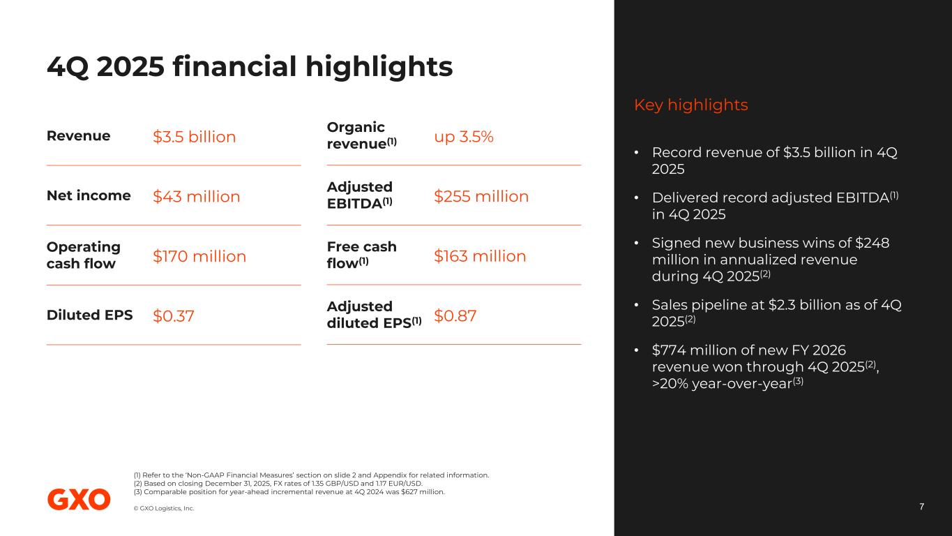 © GXO Logistics, Inc. 4Q 2025 executive summary 6 Record revenue and adjusted EBITDA(1) in 4Q and FY 2025 Accelerated expansion in strategic growth verticals, $1.1 billion of new business wins in 2025(2) Wincanton integration on track to deliver full run-rate about $60 million synergies by end of 2026 2026 mid-point guidance shows accelerated organic growth and 20% adjusted diluted EPS growth(1) (1) Refer to the ‘Non-GAAP Financial Measures’ section on slide 2. (2) Contracts converted at the prevailing rate of the quarter in which they are signed.