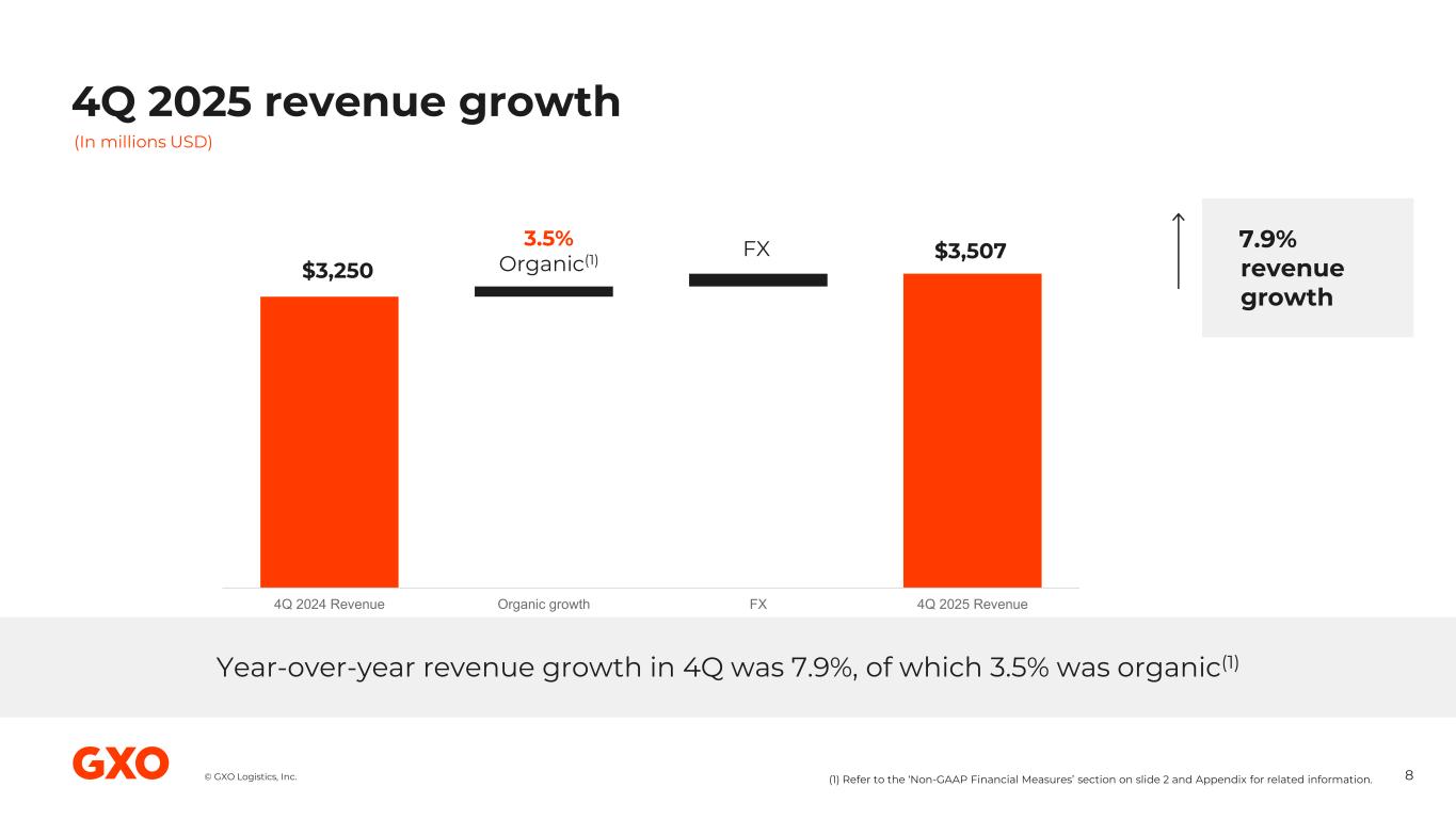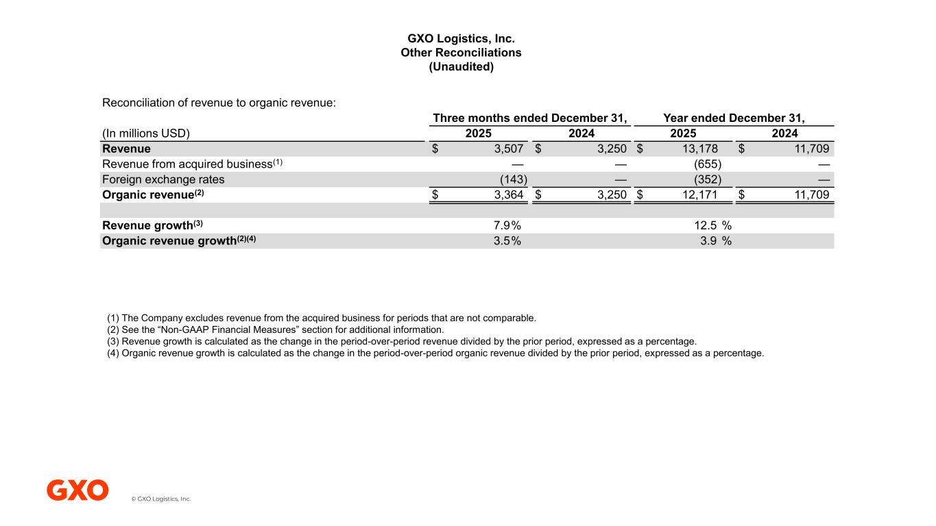 © GXO Logistics, Inc. GXO Logistics, Inc. Other Reconciliations (Unaudited) Reconciliation of revenue to organic revenue: Three months ended December 31, Year ended December 31, (In millions USD) 2025 2024 2025 2024 Revenue $ 3,507 $ 3,250 $ 13,178 $ 11,709 Revenue from acquired business(1) — — (655) — Foreign exchange rates (143) — (352) — Organic revenue(2) $ 3,364 $ 3,250 $ 12,171 $ 11,709 Revenue growth(3) 7.9% 12.5 % Organic revenue growth(2)(4) 3.5% 3.9 % (1) The Company excludes revenue from the acquired business for periods that are not comparable. (2) See the “Non-GAAP Financial Measures” section for additional information. (3) Revenue growth is calculated as the change in the period-over-period revenue divided by the prior period, expressed as a percentage. (4) Organic revenue growth is calculated as the change in the period-over-period organic revenue divided by the prior period, expressed as a percentage.