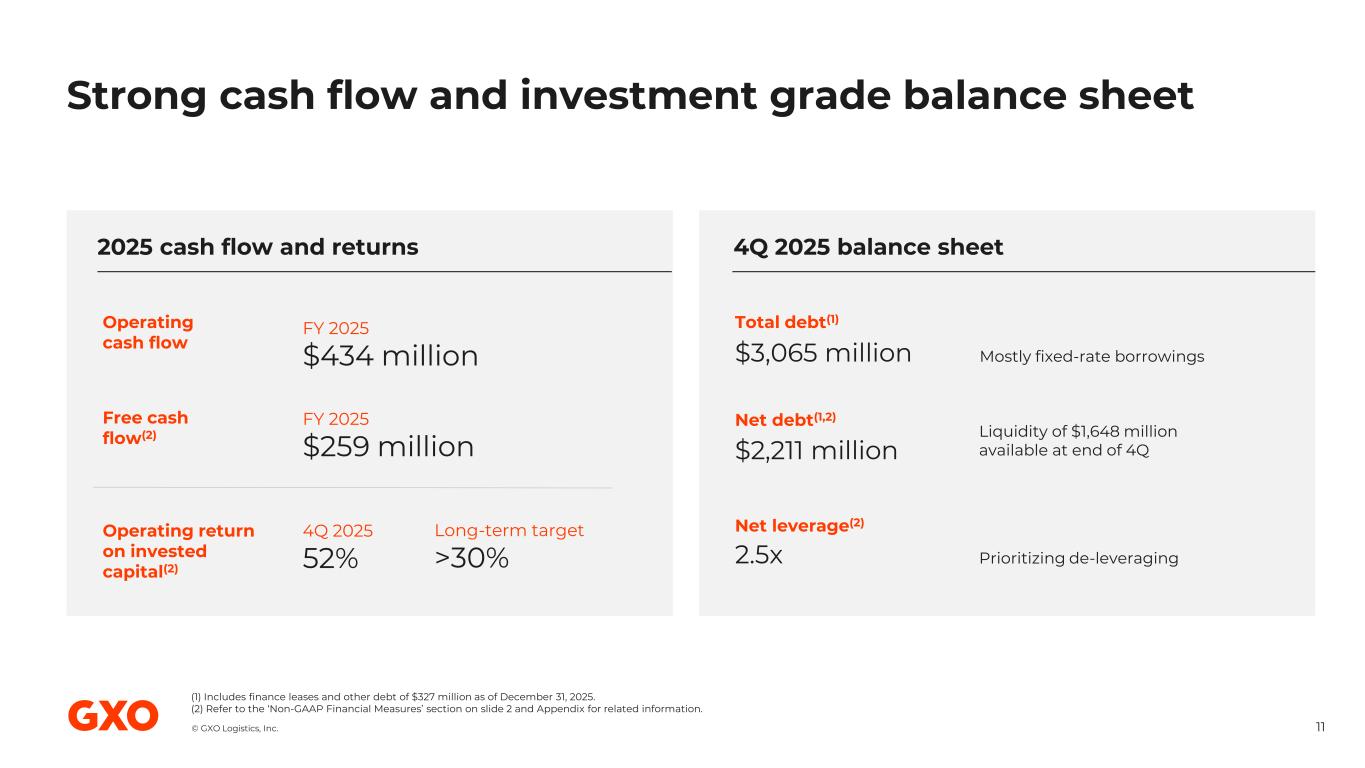 © GXO Logistics, Inc. Pre-2025 wins 1Q 2025 wins 2Q 2025 wins 3Q 2025 wins 4Q 2025 wins 2026 total expected incremental revenue New contract wins and outsourcing underpin long-term growth 10 Expected incremental revenue contributions from contracts won through 4Q 2025 FY 2025 contract wins by source(2) Sites set up to support customer growth Sites previously operated by customers in-house 45% New activity 21% Outsourcing $774 million(1) signed for 2026 (1) Based on closing December 31, 2025, FX rates of 1.35 GBP/USD and 1.17 EUR/USD. (2) Based on quarterly closing FX rates. $774 million of expected incremental revenue for 2026 won through 4Q 2025(1) Sites transferred from other 3PLs 34% Won from competitors $1.1 billion total annualized contract wins