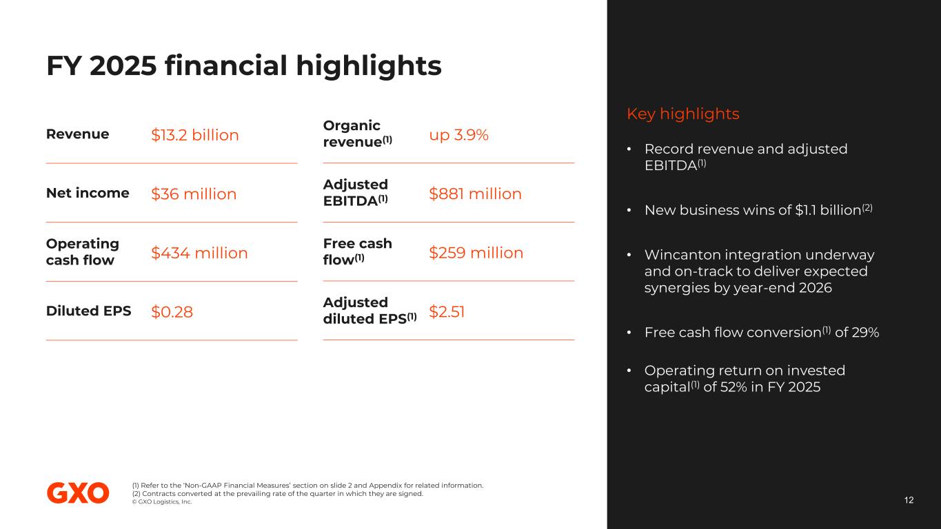 © GXO Logistics, Inc. Strong cash flow and investment grade balance sheet 11 (1) Includes finance leases and other debt of $327 million as of December 31, 2025. (2) Refer to the ‘Non-GAAP Financial Measures’ section on slide 2 and Appendix for related information. 4Q 2025 balance sheet Total debt(1) $3,065 million Mostly fixed-rate borrowings Prioritizing de-leveraging Net debt(1,2) $2,211 million Net leverage(2) 2.5x Liquidity of $1,648 million available at end of 4Q Free cash flow(2) 2025 cash flow and returns Operating return on invested capital(2) FY 2025 $434 million FY 2025 $259 million Operating cash flow 4Q 2025 52% Long-term target >30%