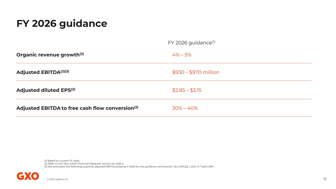 © GXO Logistics, Inc. FY 2025 financial highlights 12 (1) Refer to the ‘Non-GAAP Financial Measures’ section on slide 2 and Appendix for related information. (2) Contracts converted at the prevailing rate of the quarter in which they are signed. Key highlights • Record revenue and adjusted EBITDA(1) • New business wins of $1.1 billion(2) • Wincanton integration underway and on-track to deliver expected synergies by year-end 2026 • Free cash flow conversion(1) of 29% • Operating return on invested capital(1) of 52% in FY 2025 Revenue $13.2 billion Net income $36 million Operating cash flow $434 million Diluted EPS $0.28 Organic revenue(1) up 3.9% Adjusted EBITDA(1) $881 million Free cash flow(1) $259 million Adjusted diluted EPS(1) $2.51