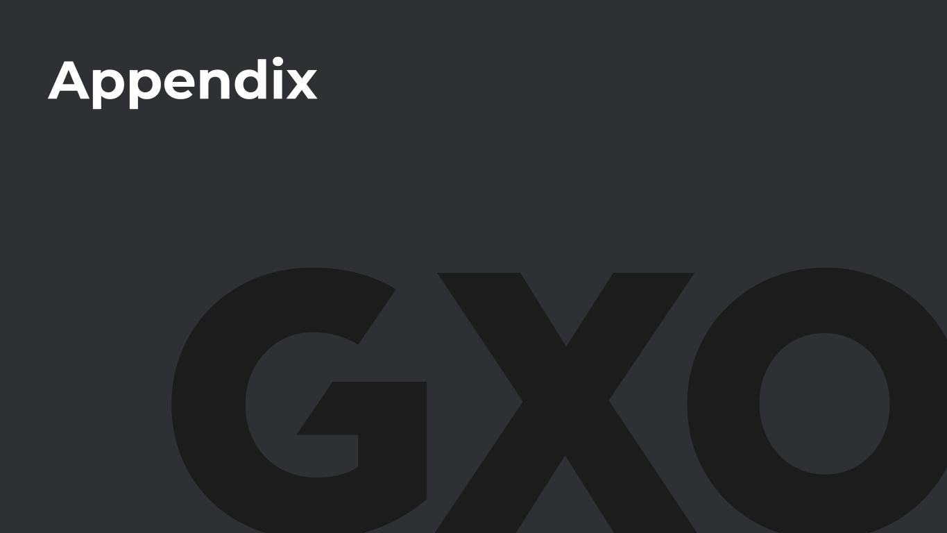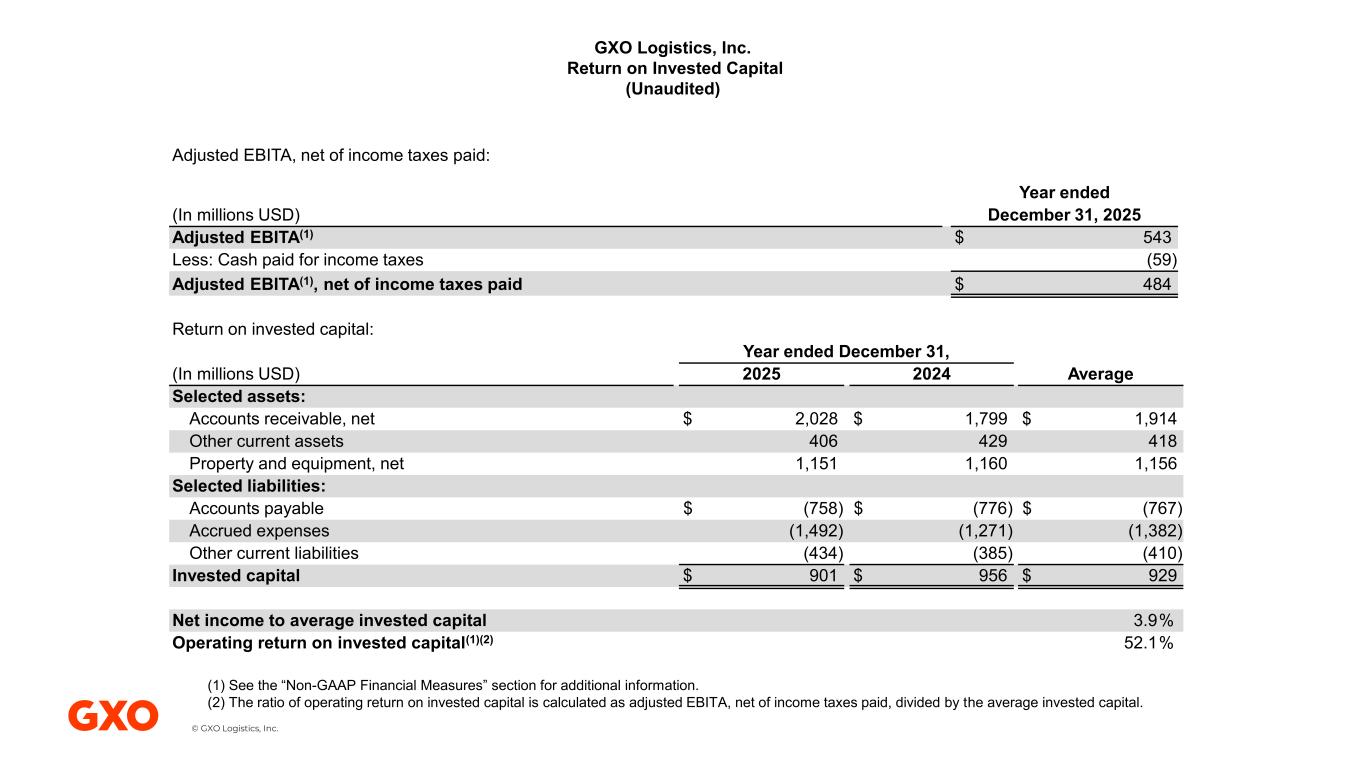 © GXO Logistics, Inc. Adjusted EBITA, net of income taxes paid: Year ended (In millions USD) December 31, 2025 Adjusted EBITA(1) $ 543 Less: Cash paid for income taxes (59) Adjusted EBITA(1), net of income taxes paid $ 484 Return on invested capital: Year ended December 31, (In millions USD) 2025 2024 Average Selected assets: Accounts receivable, net $ 2,028 $ 1,799 $ 1,914 Other current assets 406 429 418 Property and equipment, net 1,151 1,160 1,156 Selected liabilities: Accounts payable $ (758) $ (776) $ (767) Accrued expenses (1,492) (1,271) (1,382) Other current liabilities (434) (385) (410) Invested capital $ 901 $ 956 $ 929 Net income to average invested capital 3.9% Operating return on invested capital(1)(2) 52.1% GXO Logistics, Inc. Return on Invested Capital (Unaudited) (1) See the “Non-GAAP Financial Measures” section for additional information. (2) The ratio of operating return on invested capital is calculated as adjusted EBITA, net of income taxes paid, divided by the average invested capital.