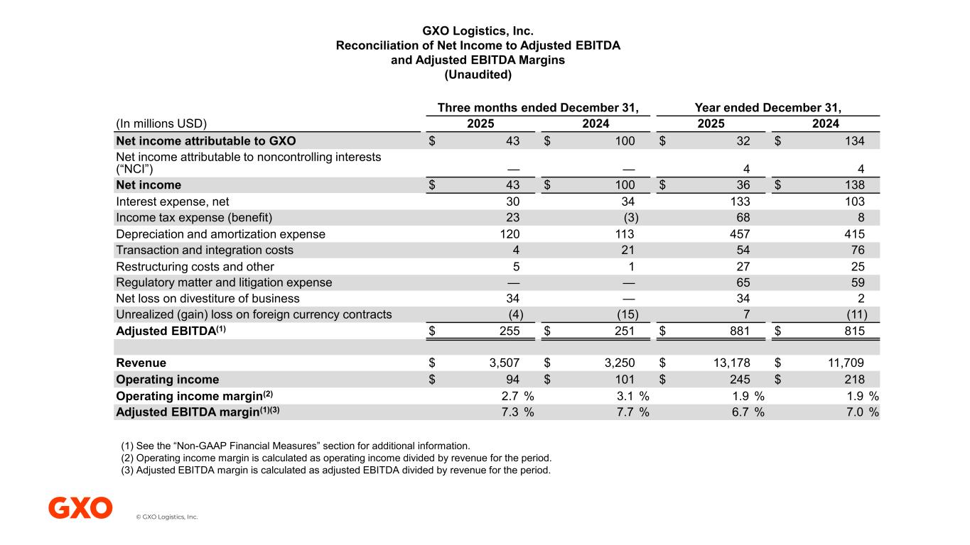 © GXO Logistics, Inc. GXO Logistics, Inc. Reconciliation of Net Income to Adjusted EBITDA and Adjusted EBITDA Margins (Unaudited) Three months ended December 31, Year ended December 31, (In millions USD) 2025 2024 2025 2024 Net income attributable to GXO $ 43 $ 100 $ 32 $ 134 Net income attributable to noncontrolling interests (“NCI”) — — 4 4 Net income $ 43 $ 100 $ 36 $ 138 Interest expense, net 30 34 133 103 Income tax expense (benefit) 23 (3) 68 8 Depreciation and amortization expense 120 113 457 415 Transaction and integration costs 4 21 54 76 Restructuring costs and other 5 1 27 25 Regulatory matter and litigation expense — — 65 59 Net loss on divestiture of business 34 — 34 2 Unrealized (gain) loss on foreign currency contracts (4) (15) 7 (11) Adjusted EBITDA(1) $ 255 $ 251 $ 881 $ 815 Revenue $ 3,507 $ 3,250 $ 13,178 $ 11,709 Operating income $ 94 $ 101 $ 245 $ 218 Operating income margin(2) 2.7 % 3.1 % 1.9 % 1.9 % Adjusted EBITDA margin(1)(3) 7.3 % 7.7 % 6.7 % 7.0 % (1) See the “Non-GAAP Financial Measures” section for additional information. (2) Operating income margin is calculated as operating income divided by revenue for the period. (3) Adjusted EBITDA margin is calculated as adjusted EBITDA divided by revenue for the period.