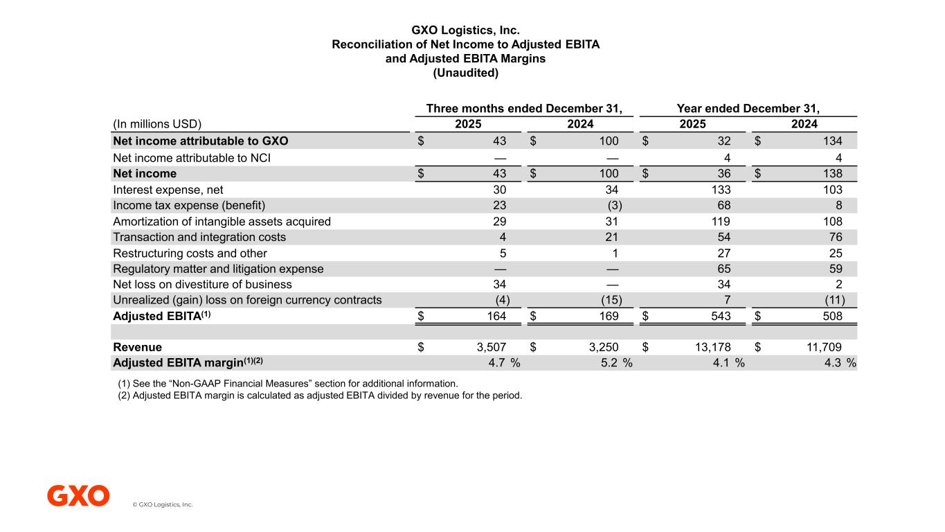 © GXO Logistics, Inc. GXO Logistics, Inc. Reconciliation of Net Income to Adjusted EBITA and Adjusted EBITA Margins (Unaudited) Three months ended December 31, Year ended December 31, (In millions USD) 2025 2024 2025 2024 Net income attributable to GXO $ 43 $ 100 $ 32 $ 134 Net income attributable to NCI — — 4 4 Net income $ 43 $ 100 $ 36 $ 138 Interest expense, net 30 34 133 103 Income tax expense (benefit) 23 (3) 68 8 Amortization of intangible assets acquired 29 31 119 108 Transaction and integration costs 4 21 54 76 Restructuring costs and other 5 1 27 25 Regulatory matter and litigation expense — — 65 59 Net loss on divestiture of business 34 — 34 2 Unrealized (gain) loss on foreign currency contracts (4) (15) 7 (11) Adjusted EBITA(1) $ 164 $ 169 $ 543 $ 508 Revenue $ 3,507 $ 3,250 $ 13,178 $ 11,709 Adjusted EBITA margin(1)(2) 4.7 % 5.2 % 4.1 % 4.3 % (1) See the “Non-GAAP Financial Measures” section for additional information. (2) Adjusted EBITA margin is calculated as adjusted EBITA divided by revenue for the period.