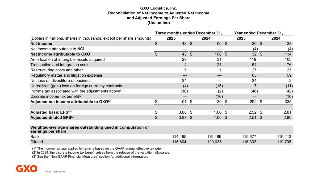 © GXO Logistics, Inc. GXO Logistics, Inc. Reconciliation of Net Income to Adjusted Net Income and Adjusted Earnings Per Share (Unaudited) Three months ended December 31, Year ended December 31, (Dollars in millions, shares in thousands, except per share amounts) 2025 2024 2025 2024 Net income $ 43 $ 100 $ 36 $ 138 Net income attributable to NCI — — (4) (4) Net income attributable to GXO $ 43 $ 100 $ 32 $ 134 Amortization of intangible assets acquired 29 31 119 108 Transaction and integration costs 4 21 54 76 Restructuring costs and other 5 1 27 25 Regulatory matter and litigation expense — — 65 59 Net loss on divestiture of business 34 — 34 2 Unrealized (gain) loss on foreign currency contracts (4) (15) 7 (11) Income tax associated with the adjustments above(1) (10) (2) (46) (42) Discrete income tax benefit(2) — (16) — (16) Adjusted net income attributable to GXO(3) $ 101 $ 120 $ 292 $ 335 Adjusted basic EPS(3) $ 0.88 $ 1.00 $ 2.52 $ 2.81 Adjusted diluted EPS(3) $ 0.87 $ 1.00 $ 2.51 $ 2.80 Weighted-average shares outstanding used in computation of earnings per share Basic 114,495 119,489 115,677 119,413 Diluted 115,604 120,035 116,303 119,798 (1) The income tax rate applied to items is based on the GAAP annual effective tax rate. (2) In 2024, the discrete income tax benefit arises from the release of the valuation allowance. (3) See the “Non-GAAP Financial Measures” section for additional information.