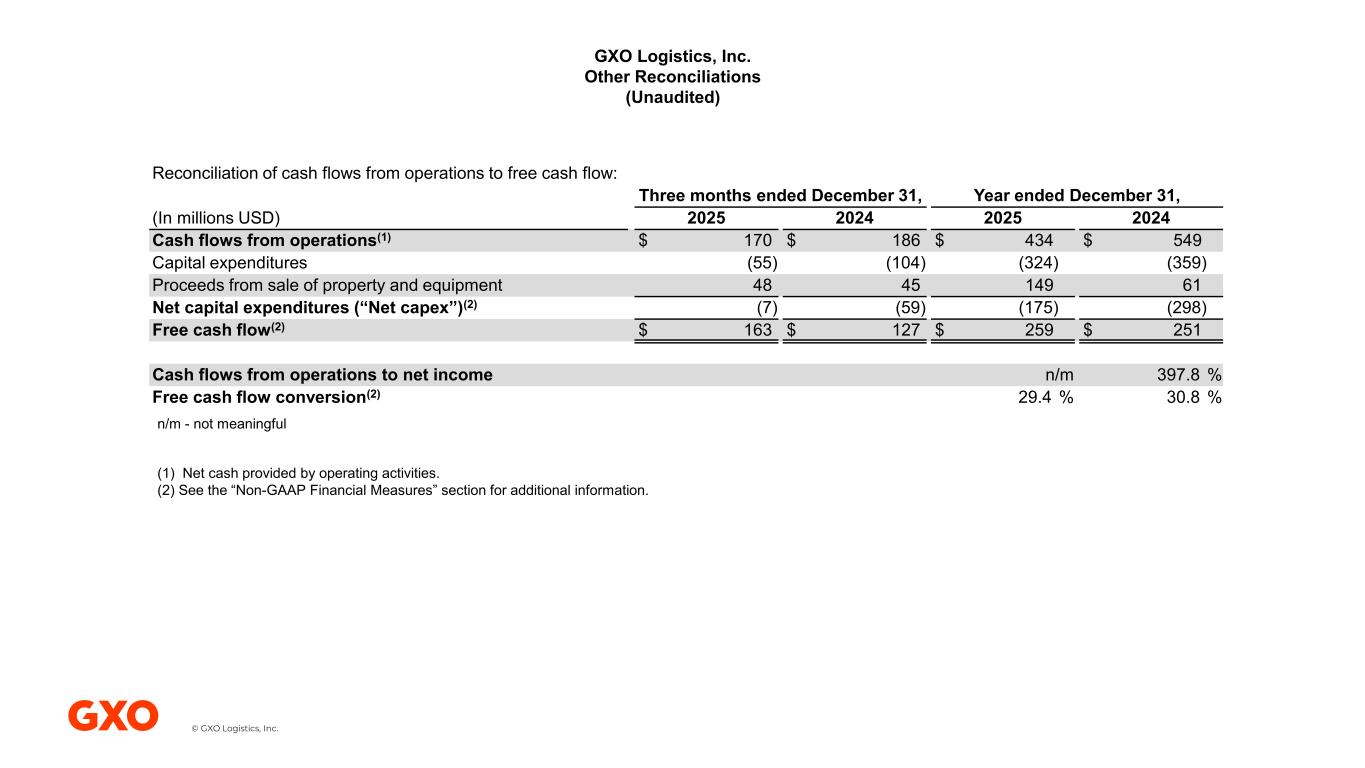 © GXO Logistics, Inc. GXO Logistics, Inc. Other Reconciliations (Unaudited) Reconciliation of cash flows from operations to free cash flow: Three months ended December 31, Year ended December 31, (In millions USD) 2025 2024 2025 2024 Cash flows from operations(1) $ 170 $ 186 $ 434 $ 549 Capital expenditures (55) (104) (324) (359) Proceeds from sale of property and equipment 48 45 149 61 Net capital expenditures (“Net capex”)(2) (7) (59) (175) (298) Free cash flow(2) $ 163 $ 127 $ 259 $ 251 Cash flows from operations to net income n/m 397.8 % Free cash flow conversion(2) 29.4 % 30.8 % (1) Net cash provided by operating activities. (2) See the “Non-GAAP Financial Measures” section for additional information. n/m - not meaningful
