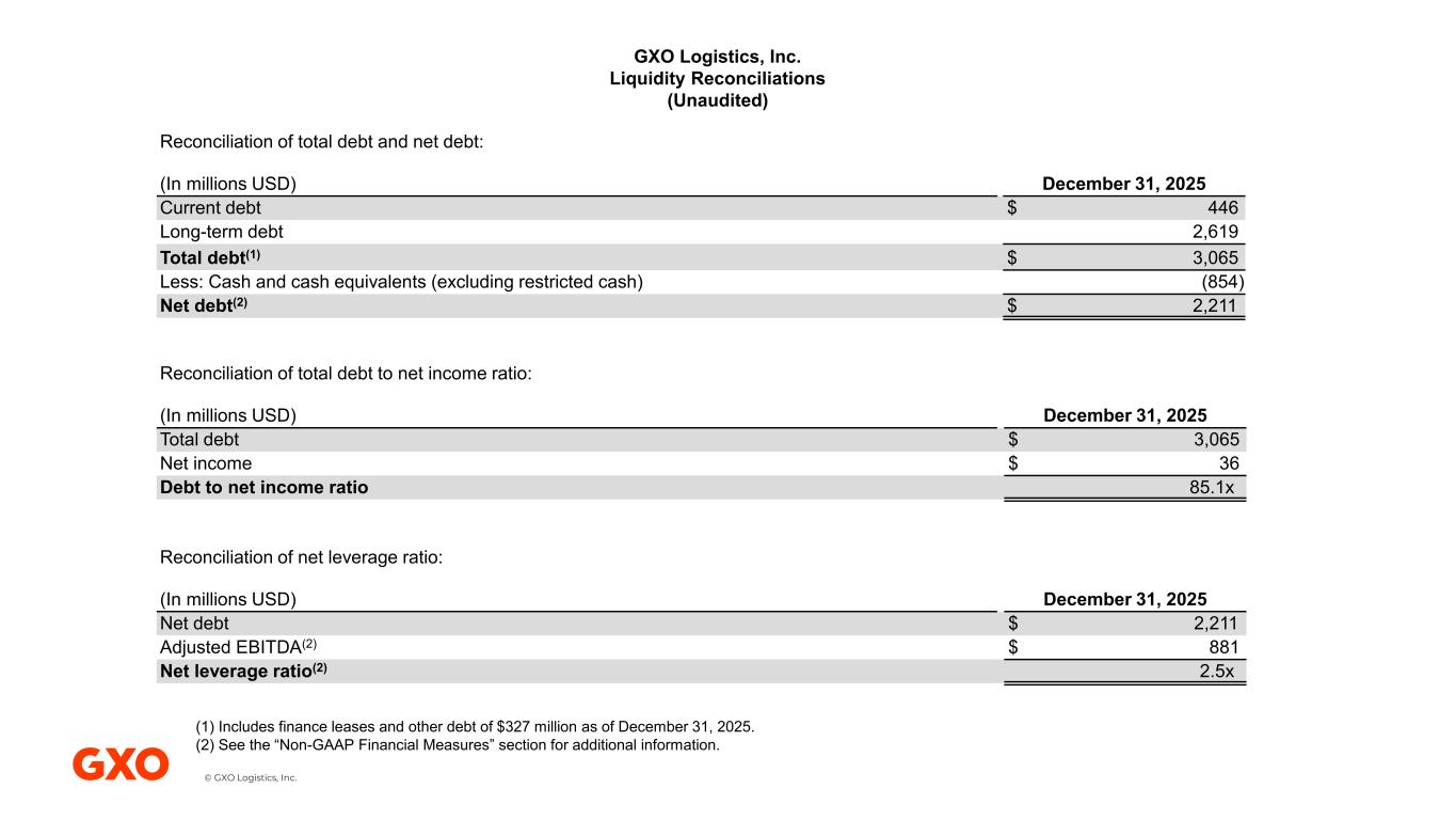 © GXO Logistics, Inc. GXO Logistics, Inc. Liquidity Reconciliations (Unaudited) Reconciliation of total debt and net debt: (In millions USD) December 31, 2025 Current debt $ 446 Long-term debt 2,619 Total debt(1) $ 3,065 Less: Cash and cash equivalents (excluding restricted cash) (854) Net debt(2) $ 2,211 Reconciliation of total debt to net income ratio: (In millions USD) December 31, 2025 Total debt $ 3,065 Net income $ 36 Debt to net income ratio 85.1x Reconciliation of net leverage ratio: (In millions USD) December 31, 2025 Net debt $ 2,211 Adjusted EBITDA(2) $ 881 Net leverage ratio(2) 2.5x (1) Includes finance leases and other debt of $327 million as of December 31, 2025. (2) See the “Non-GAAP Financial Measures” section for additional information.