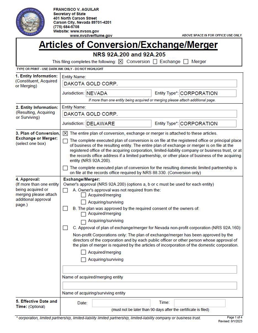 Important Notice Regarding the Availability of Proxy Materials for the Annual Stockholders Meeting to be Held on May 14, 2024: The Proxy Statement, Proxy Card and Annual Report to Stockholders, including financial statements for the fiscal year ended December 31, 2023, are available at https://odysseytrust.com/client/dakota-gold-corp/.