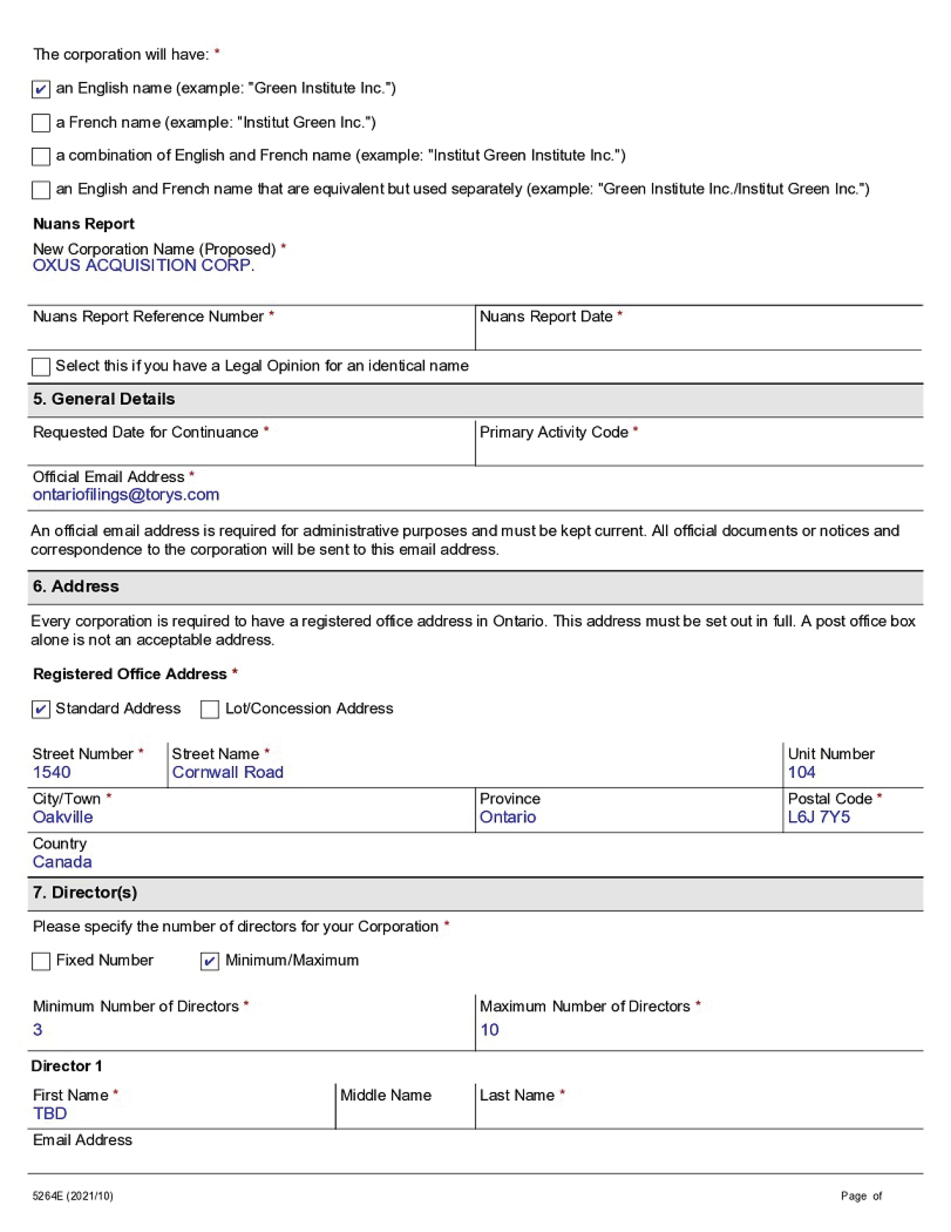 3. The Governing Documents Proposals: To consider and vote upon a proposal (the “Governing Documents Proposals”) to approve, by special resolution, and adopt the articles and by-laws of New Borealis in substantially the form attached to the proxy statement/prospectus as Annex J (the “New Borealis Governing Documents”) for purposes of the articles and by-laws of New Borealis following the completion of the Amalgamations. In addition to voting on the adoption of the New Borealis Governing Documents in their entirety, Governing Documents Proposals are separated into sub-proposals submitted to Oxus Shareholders to vote upon those material aspects of the