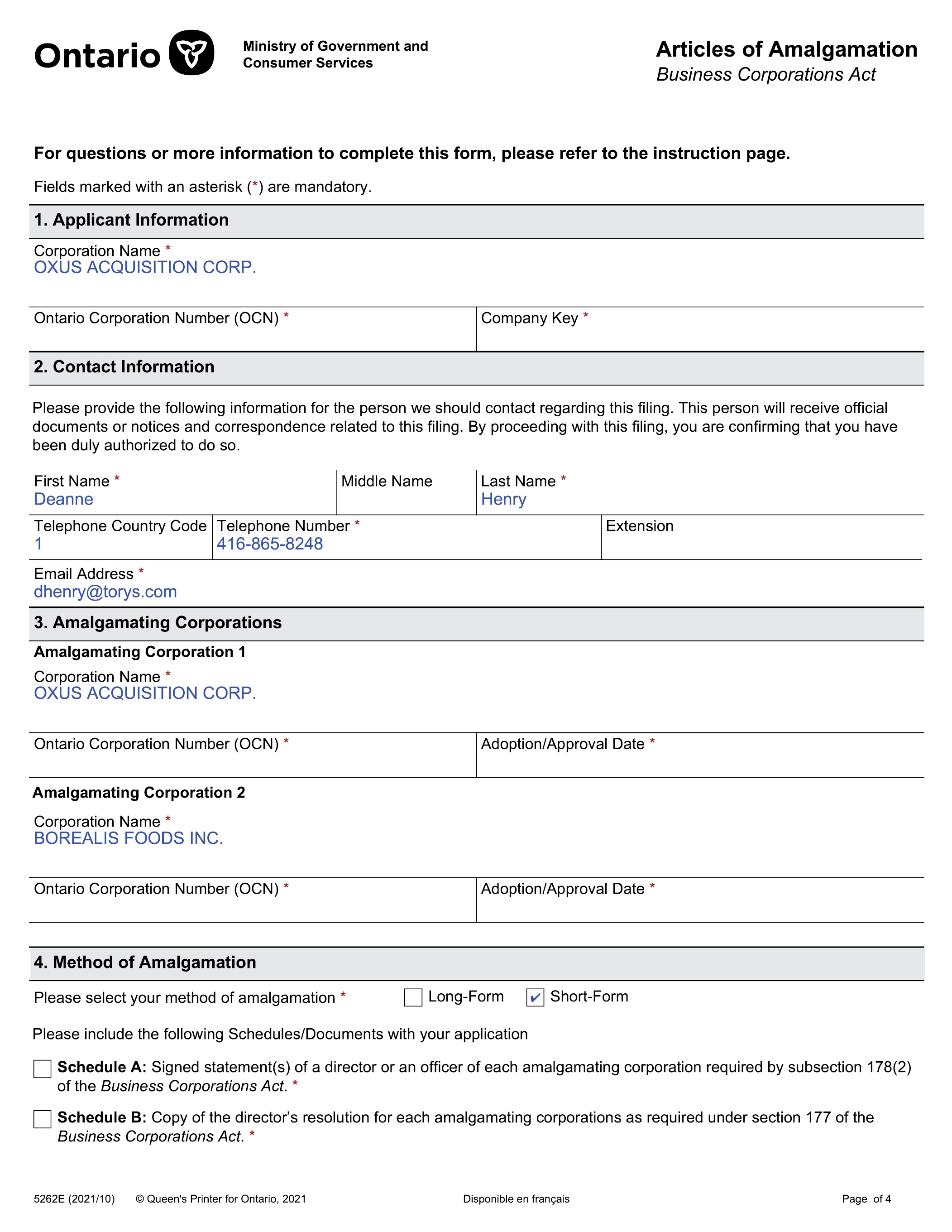• the New Oxus Amalgamation will be completed, with New Borealis surviving as the amalgamated corporation resulting therefrom;