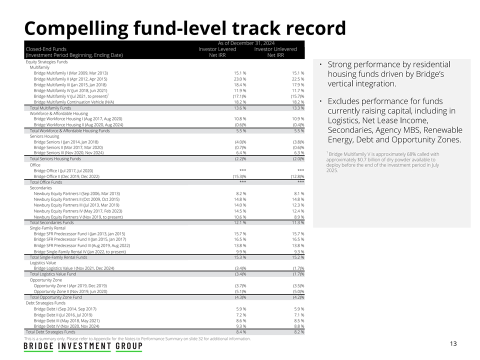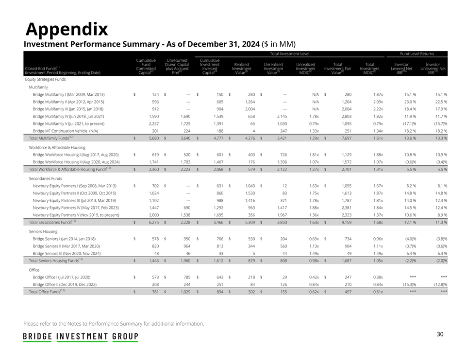 Appendix Investment Performance Summary - As of December 31, 2024 ($ in MM) Total Investment-Level Fund-Level Returns Cumulative Unreturned Cumulative Fund Drawn Capital Investment Realized Unrealized Unrealized Total Total Investor Investor (1) Closed-End Funds Committed plus Accrued Invested Investment Investment Investment Investment Fair Investment Levered Net Unlevered Net (2) (3) (4) (5) (6) (7) (8) (9) (10) (11) (Investment Period Beginning, Ending Date) Capital Pref Capital Value Value MOIC Value MOIC IRR IRR Equity Strategies Funds Multifamily Bridge Multifamily I (Mar 2009, Mar 2013) $ 124 $ — $ 150 $ 280 $ — N/A $ 280 1.87x 1 5.1 % 15.1 % Bridge Multifamily II (Apr 2012, Apr 2015) 596 — 605 1,264 — N/A 1,264 2.09x 23.0 % 22.5 % Bridge Multifamily III (Jan 2015, Jan 2018) 912 — 904 2,004 — N/A 2,004 2.22x 18.4 % 17.9 % Bridge Multifamily IV (Jun 2018, Jun 2021) 1,590 1,690 1,539 658 2,145 1.78x 2,803 1.82x 11.9 % 11.7 % Bridge Multifamily V (Jul 2021, to present) 2,257 1,725 1,391 65 1,030 0.79x 1,095 0.79x (17.1)% ( 15.7) % Bridge MF Continuation Vehicle (N/A) 201 224 188 4 247 1.33x 251 1.34x 1 8.2 % 18.2 % (12) Total Multifamily Funds $ 5,680 $ 3,640 $ 4,777 $ 4,276 $ 3,421 1.29x $ 7,697 1.61x 13.6 % 13.3 % Workforce & Affordable Housing Bridge Workforce Housing I (Aug 2017, Aug 2020) $ 619 $ 520 $ 601 $ 403 $ 726 1.81x $ 1,129 1.88x 1 0.8 % 10.9 % Bridge Workforce Housing II (Aug 2020, Aug 2024) 1,741 1,703 1,467 176 1,396 1.07x 1,572 1.07x (0.6) % (0.4)% (12) Total Workforce & Affordable Housing Funds $ 2,360 $ 2,223 $ 2,068 $ 579 $ 2,122 1.27x $ 2,701 1.31x 5 .5 % 5.5 % Secondaries Funds Newbury Equity Partners I (Sep 2006, Mar 2013) $ 702 $ — $ 631 $ 1,043 $ 12 1.63x $ 1,055 1.67x 8 .2 % 8.1 % Newbury Equity Partners II (Oct 2009, Oct 2015) 1,024 — 860 1,530 83 1.75x 1,613 1.87x 1 4.8 % 1 4.8 % Newbury Equity Partners III (Jul 2013, Mar 2019) 1,102 — 988 1,416 371 1.78x 1,787 1.81x 14.0 % 1 2.3 % Newbury Equity Partners IV (May 2017, Feb 2023) 1,447 690 1,292 963 1,417 1.88x 2,381 1.84x 1 4.5 % 12.4 % Newbury Equity Partners V (Nov 2019, to present) 2,000 1,538 1,695 356 1,967 1.36x 2,323 1.37x 1 0.6 % 8.9 % (12) Total Secondaries Funds $ 6,275 $ 2,228 $ 5,466 $ 5,309 $ 3,850 1.63x $ 9,159 1.68x 1 2.1 % 1 1.3 % Seniors Housing Bridge Seniors I (Jan 2014, Jan 2018) $ 578 $ 950 $ 766 $ 530 $ 204 0.69x $ 734 0.96x (4.0)% (3.8) % Bridge Seniors II (Mar 2017, Mar 2020) 820 964 813 344 560 1.13x 904 1.11x ( 0.7) % (0.6)% Bridge Seniors III (Nov 2020, Nov 2024) 48 46 33 5 44 1.49x 49 1.49x 6 .4 % 6 .3 % (12) Total Seniors Housing Funds $ 1,446 $ 1,960 $ 1,612 $ 879 $ 808 0.98x $ 1,687 1.05x (2.2)% ( 2.0)% Office Bridge Office I (Jul 2017, Jul 2020) $ 573 $ 785 $ 643 $ 218 $ 29 0.42x $ 247 0.38x *** *** Bridge Office II (Dec 2019, Dec 2022) 208 244 251 84 126 0.84x 210 0.84x ( 15.3) % (12.8)% (12) Total Office Funds $ 781 $ 1,029 $ 894 $ 302 $ 155 0.62x $ 457 0.51x *** *** Please refer to the Notes to Performance Summary for additional information. 30
