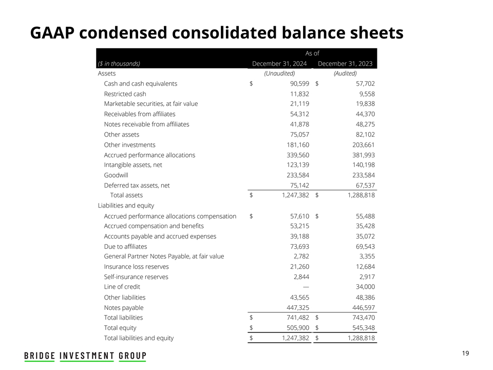 GAAP condensed consolidated balance sheets As of ($ in thousands) December 31, 2024 December 31, 2023 Assets (Unaudited) (Audited) Cash and cash equivalents $ 90,599 $ 57,702 Restricted cash 11,832 9,558 Marketable securities, at fair value 21,119 19,838 Receivables from affiliates 54,312 44,370 Notes receivable from affiliates 41,878 48,275 Other assets 75,057 82,102 Other investments 181,160 203,661 Accrued performance allocations 339,560 381,993 Intangible assets, net 123,139 140,198 Goodwill 233,584 233,584 Deferred tax assets, net 75,142 67,537 Total assets $ 1,247,382 $ 1,288,818 Liabilities and equity Accrued performance allocations compensation $ 57,610 $ 55,488 Accrued compensation and benefits 53,215 35,428 Accounts payable and accrued expenses 39,188 35,072 Due to affiliates 73,693 69,543 General Partner Notes Payable, at fair value 2,782 3,355 Insurance loss reserves 21,260 12,684 Self-insurance reserves 2,844 2,917 Line of credit — 34,000 Other liabilities 43,565 48,386 Notes payable 447,325 446,597 Total liabilities $ 741,482 $ 743,470 Total equity $ 505,900 $ 545,348 Total liabilities and equity $ 1,247,382 $ 1,288,818 19