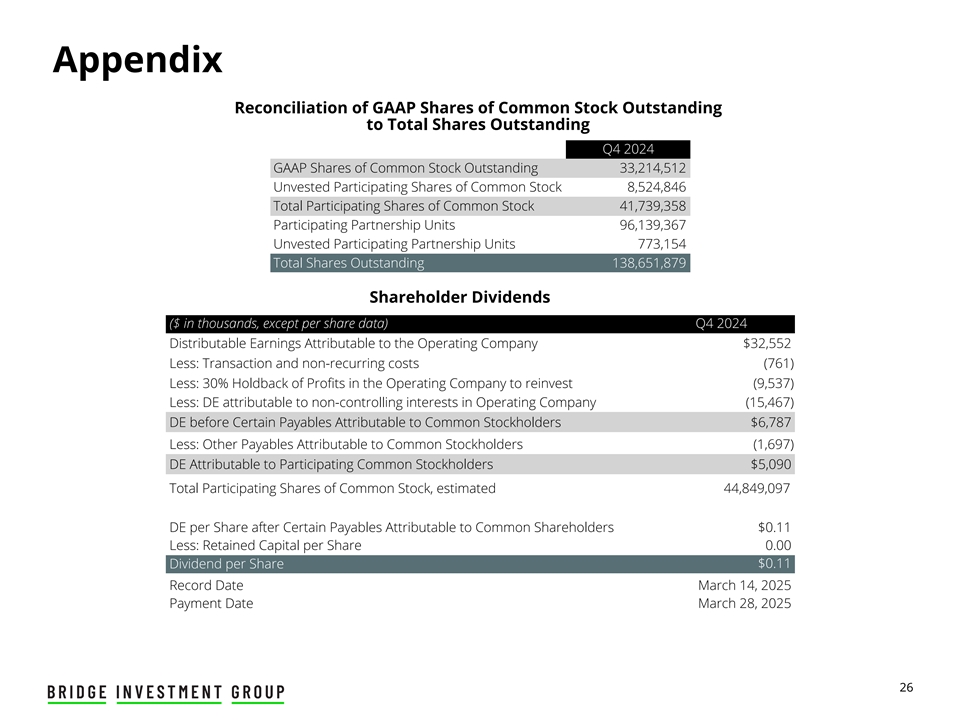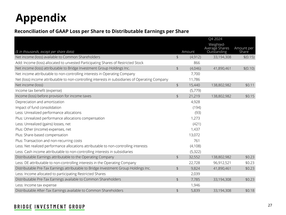 Appendix Unaudited Historical Reconciliation of Non-GAAP Distributable Earnings per Share Three Months Ended ($ in thousands, except per share and per share amounts) 12/31/2022 3/31/2023 6/30/2023 9/30/2023 12/31/2023 3/31/2024 6/30/2024 9/30/2024 12/31/2024 Numerator: Distributable Earnings ( DE ) attributable to the Operating Company $ 35,637 $ 33,395 $ 35,006 $ 40,798 $ 25,294 $ 32,171 $ 35,487 $ 28,229 $ 32,552 Less: DE attributable to non-controlling interests in the Operating Company (27,488) (25,230) (26,436) (30,665) (18,704) (22,734) (24,812) (19,723) (22,728) DE attributable to Bridge Investment Group Holdings Inc. 8,149 8,165 8,570 10,133 6,590 9,437 10,675 8,506 9,824 Less: Income allocated to participating Restricted Shares (1,405) (1,917) (1,998) (2,393) (1,445) (2,177) (2,372) (1,796) (2,039) DE available to common shareholders 6,744 6,248 6,572 7,740 5,145 7,260 8,303 6,710 7,785 Income tax benefit (expense) (1,686) (1,562) (1,643) (1,935) (1,286) (1,815) (2,076) (1,678) (1,946) After-tax DE available to common shareholders $ 5,058 $ 4,686 $ 4,929 $ 5,805 $ 3,859 $ 5,445 $ 6,227 $ 5,032 $ 5,839 Denominator: Weighted-average shares of Class A Common stock outstanding— Basic and Diluted 24,373,172 25,068,319 25,143,289 25,956,587 27,798,236 31,342,979 32,461,347 32,991,925 33,194,308 After-Tax Non-GAAP Distributable Earnings Per Share $ 0.21 $ 0.19 $ 0.20 $ 0.22 $ 0.14 $ 0.17 $ 0.19 $ 0.15 $ 0.18 22
