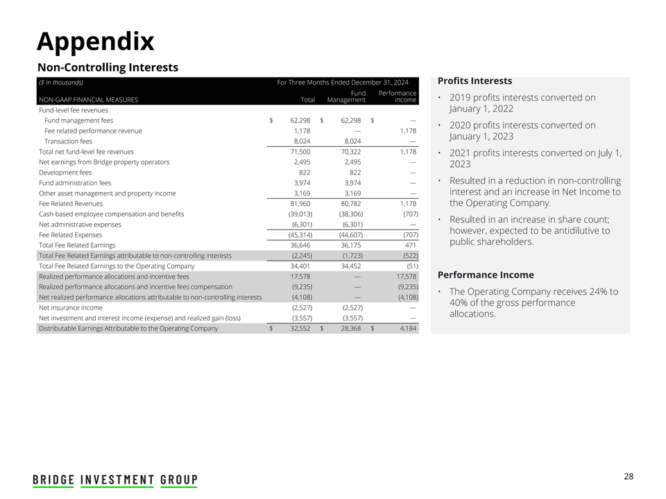 Appendix Non-Controlling Interests Profits Interests ($ in thousands) For Three Months Ended December 31, 2024 Fund Performance • 2019 profits interests converted on NON-GAAP FINANCIAL MEASURES Total Management income January 1, 2022 Fund-level fee revenues Fund management fees $ 62,298 $ 62,298 $ — • 2020 profits interests converted on Fee related performance revenue 1,178 — 1,178 January 1, 2023 8,024 8,024 — Transaction fees Total net fund-level fee revenues 71,500 70,322 1,178 • 2021 profits interests converted on July 1, Net earnings from Bridge property operators 2,495 2,495 — 2023 Development fees 822 822 — • Resulted in a reduction in non-controlling — Fund administration fees 3,974 3,974 interest and an increase in Net Income to Other asset management and property income 3,169 3,169 — Fee Related Revenues 81,960 80,782 1,178 the Operating Company. Cash-based employee compensation and benefits (39,013) (38,306) (707) • Resulted in an increase in share count; — Net administrative expenses (6,301) (6,301) however, expected to be antidilutive to Fee Related Expenses (45,314) (44,607) (707) public shareholders. Total Fee Related Earnings 36,646 36,175 471 Total Fee Related Earnings attributable to non-controlling interests (2,245) (1,723) (522) Total Fee Related Earnings to the Operating Company 34,401 34,452 (51) Performance Income Realized performance allocations and incentive fees 17,578 — 17,578 Realized performance allocations and incentive fees compensation (9,235) — (9,235) • The Operating Company receives 24% to Net realized performance allocations attributable to non-controlling interests (4,108) — (4,108) 40% of the gross performance — Net insurance income (2,527) (2,527) allocations. Net investment and interest income (expense) and realized gain (loss) (3,557) (3,557) — Distributable Earnings Attributable to the Operating Company $ 32,552 $ 28,368 $ 4,184 28