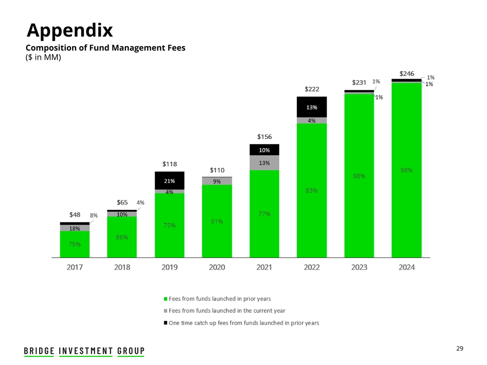 Appendix Unaudited Historical Non-GAAP Measures Three Months Ended ($ in thousands) 12/31/2022 3/31/2023 6/30/2023 9/30/2023 12/31/2023 3/31/2024 6/30/2024 9/30/2024 12/31/2024 Fund-level fee revenues Fund management fees $ 55,408 $ 53,849 $ 60,353 $ 61,584 $ 55,040 $ 61,184 $ 61,193 $ 61,106 $ 62,298 Fee related performance revenue — — — — — — — 5,036 1,178 Transaction fees 5,033 2,377 4,682 9,679 3,729 6,800 6,404 6,279 8,024 Total net fund-level fee revenues 60,441 56,226 65,035 71,263 58,769 67,984 67,597 72,421 71,500 Net earnings from Bridge property operators 4,164 3,243 2,828 2,142 2,891 2,737 1,778 951 2,495 Development fees 1,651 335 1,337 247 999 831 828 896 822 Fund administration fees 3,925 4,177 4,304 4,556 4,773 5,132 4,653 4,300 3,974 Other asset management and property income 2,475 2,797 2,636 3,289 3,092 2,665 5,514 3,906 3,169 Fee Related Revenues 72,656 66,778 76,140 81,497 70,524 79,349 80,370 82,474 81,960 Cash-based employee compensation and benefits (29,351) (31,623) (35,248) (37,275) (35,518) (39,909) (38,715) (44,779) (39,013) Net administrative expenses (7,968) (6,139) (6,663) (7,109) (5,886) (6,216) (6,696) (5,447) (6,301) Fee Related Expenses (37,319) (37,762) (41,911) (44,384) (41,404) (46,125) (45,411) (50,226) (45,314) Total Fee Related Earnings 35,337 29,016 34,229 37,113 29,120 33,224 34,959 32,248 36,646 Total Fee Related Earnings attributable to non-controlling interests (4,424) 1,856 865 (1,074) (581) 719 924 110 (2,245) Total Fee Related Earnings to the Operating Company 30,913 30,872 35,094 36,039 28,539 33,943 35,883 32,358 34,401 Realized performance allocations and incentive fees 4,455 3,162 8,466 20,225 9,290 12,969 7,063 5,398 17,578 Realized performance allocations and incentive fees compensation (349) (1,732) (498) (2,713) (2,840) (7,407) (3,748) (3,154) (9,235) Net realized performance allocations attributable to non- controlling interests (2,357) (619) (5,066) (10,280) (4,220) (2,448) (1,608) (862) (4,108) Net insurance income 3,083 2,409 1,801 1,701 324 2,015 1,969 (1,611) (2,527) Earnings from investments in real estate 60 — 215 537 — — — — — Net investment and interest income (expense) and realized gain (loss) (168) (697) (5,006) (4,711) (5,799) (6,901) (4,072) (3,900) (3,557) Distributable Earnings attributable to the Operating Company $ 35,637 $ 33,395 $ 35,006 $ 40,798 $ 25,294 $ 32,171 $ 35,487 $ 28,229 $ 32,552 21