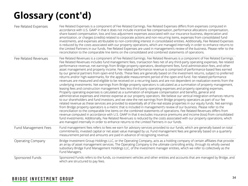 Glossary Assets under management, or AUM, represents the sum of (a) the fair value of the assets of the funds and vehicles we manage, Assets Under Management plus (b) the contractual amount of any uncalled capital commitments to those funds and vehicles (including our commitments to the funds and vehicles and those of Bridge affiliates), plus (c) the fair value of the assets of any REITs managed by our affiliates, including Bridge Investment Group Industrial Real Estate Income Trust (“BIGi”). Our AUM is not reduced by any outstanding indebtedness or other accrued but unpaid liabilities of the assets we manage. Our calculations of AUM and fee-earning AUM may differ from the calculations of other investment managers. As a result, these measures may not be comparable to similar measures presented by other investment managers, and differs from the manner in which our affiliates registered with the SEC report “Regulatory Assets Under Management” on Form ADV and Form PF. In addition, our calculation of AUM includes uncalled commitments to (and the fair value of the assets in) the funds and vehicles we manage from Bridge and Bridge affiliates, regardless of whether such commitments or investments are subject to fees. Our definition of AUM is not based on any definition contained in the agreements governing the funds and vehicles we manage or advise. Distributable Earnings, or DE, is a key performance measure used in our industry and is evaluated regularly by management in Distributable Earnings making resource deployment and compensation decisions, and in assessing our performance. DE differs from net income before provision for income taxes, computed in accordance with U.S. GAAP in that it does not include depreciation and amortization, income (loss) from consolidated fund investments, unrealized performance allocations and related compensation expense, unrealized gains (losses), share-based compensation, cash income attributable to non-controlling interests, charges (credits) related to corporate actions and non-recurring items. Although we believe the inclusion or exclusion of these items provides investors with a meaningful indication of our core operating performance, the use of DE without consideration of the related U.S. GAAP measures is not adequate due to the adjustments described herein. This measure supplements and should be considered in addition to and not in lieu of the results of operations discussed further in our most recent annual report on Form 10-K and quarterly report of Form 10-Q under “Management’s Discussion and Analysis of Financial Condition and Results of Operations— Key Components of our Results of Operations—Combined Results of Operations” prepared in accordance with U.S. GAAP. Our calculations of DE may differ from the calculations of other investment managers. As a result, these measures may not be comparable to similar measures presented by other investment managers. Dry Powder represents of uncalled committed capital that is available for investment. Dry Powder Fee-Earning AUM, or FEAUM, reflects the assets from which we earn management fee revenue. The assets we manage that are Fee-Earning AUM included in our FEAUM typically pay management fees based on capital commitments, invested capital or, in certain cases, NAV, depending on the fee terms. Fee Related Earnings Fee Related Earnings, or FRE, is a supplemental performance measure used to assess our ability to generate profits from fee- based revenues that are measured and received on a recurring basis. FRE differs from income before provision for income taxes computed in accordance with U.S. GAAP in that it adjusts for the items included in the calculation of Distributable Earnings, and also adjusts Distributable Earnings to exclude realized performance allocations income and related compensation expense, net insurance income, earnings from investments, net interest (interest income less interest expense), net realized gain (loss), income (loss) from consolidated fund investments, and, if applicable, certain general and administrative expenses when the timing of any future payment is uncertain. FRE is not a measure of performance calculated in accordance with U.S. GAAP. The use of FRE without consideration of the related U.S. GAAP measures is not adequate due to the adjustments described herein. Our calculations of FRE may differ from the calculations of other investment managers. As a result, these measures may not be comparable to similar measures presented by other investment managers. 33