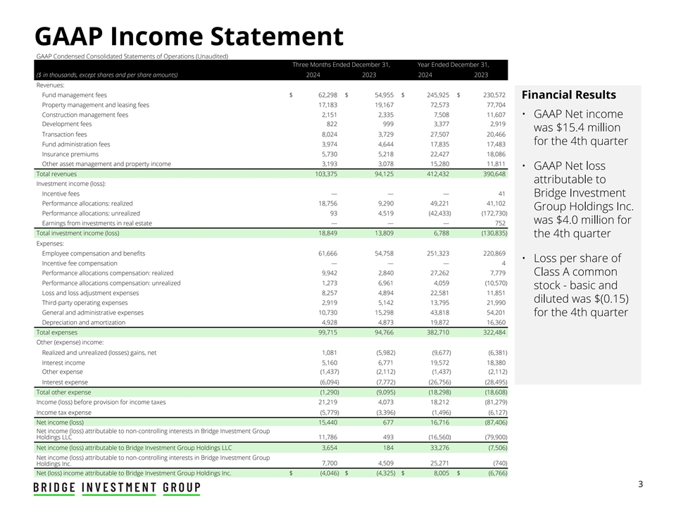GAAP Income Statement GAAP Condensed Consolidated Statements of Operations (Unaudited) Three Months Ended December 31, Year Ended December 31, ($ in thousands, except shares and per share amounts) 2024 2023 2024 2023 Revenues: Fund management fees $ 62,298 $ 54,955 $ 245,925 $ 230,572 Financial Results Property management and leasing fees 17,183 19,167 72,573 77,704 Construction management fees 2,151 2,335 7,508 11,607 • GAAP Net income Development fees 822 999 3,377 2,919 was $15.4 million Transaction fees 8,024 3,729 27,507 20,466 for the 4th quarter Fund administration fees 3,974 4,644 17,835 17,483 Insurance premiums 5,730 5,218 22,427 18,086 Other asset management and property income 3,193 3,078 15,280 11,811 • GAAP Net loss Total revenues 103,375 94,125 412,432 390,648 attributable to Investment income (loss): Incentive fees — — — 41 Bridge Investment Performance allocations: realized 18,756 9,290 49,221 41,102 Group Holdings Inc. Performance allocations: unrealized 93 4,519 (42,433) (172,730) was $4.0 million for Earnings from investments in real estate — — — 752 Total investment income (loss) 18,849 13,809 6,788 (130,835) the 4th quarter Expenses: Employee compensation and benefits 61,666 54,758 251,323 220,869 • Loss per share of Incentive fee compensation — — — 4 Performance allocations compensation: realized 9,942 2,840 27,262 7,779 Class A common Performance allocations compensation: unrealized 1,273 6,961 4,059 (10,570) stock - basic and Loss and loss adjustment expenses 8,257 4,894 22,581 11,851 diluted was $(0.15) Third-party operating expenses 2,919 5,142 13,795 21,990 General and administrative expenses 10,730 15,298 43,818 54,201 for the 4th quarter Depreciation and amortization 4,928 4,873 19,872 16,360 Total expenses 99,715 94,766 382,710 322,484 Other (expense) income: Realized and unrealized (losses) gains, net 1,081 (5,982) (9,677) (6,381) Interest income 5,160 6,771 19,572 18,380 Other expense (1,437) (2,112) (1,437) (2,112) Interest expense (6,094) (7,772) (26,756) (28,495) Total other expense (1,290) (9,095) (18,298) (18,608) Income (loss) before provision for income taxes 21,219 4,073 18,212 (81,279) Income tax expense (5,779) (3,396) (1,496) (6,127) Net income (loss) 15,440 677 16,716 (87,406) Net income (loss) attributable to non-controlling interests in Bridge Investment Group Holdings LLC 11,786 493 (16,560) (79,900) Net income (loss) attributable to Bridge Investment Group Holdings LLC 3,654 184 33,276 (7,506) Net income (loss) attributable to non-controlling interests in Bridge Investment Group Holdings Inc. 7,700 4,509 25,271 (740) Net (loss) income attributable to Bridge Investment Group Holdings Inc. $ (4,046) $ (4,325) $ 8,005 $ (6,766) 3
