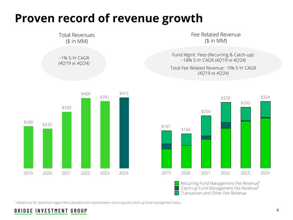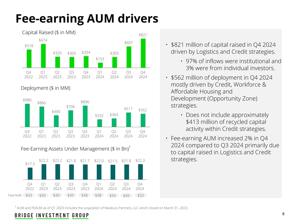Disclaimer The information contained herein does not constitute or form part of, and should not be construed as, an offer or invitation to subscribe for, underwrite or otherwise acquire, any securities of Bridge Investment Group Holdings Inc. (“Bridge” or the “Company”), Bridge Investment Group Holdings LLC (the “Operating Company”) or any affiliate of Bridge, or any fund or other investment vehicle managed by Bridge or an affiliate of Bridge. This presentation should not form the basis of, or be relied on in connection with, any contract to purchase or subscribe for any securities of Bridge or any fund or other investment vehicle managed by Bridge or an affiliate of Bridge, or in connection with any other contract or commitment whatsoever. This presentation does not constitute a “prospectus” within the meaning of the Securities Act of 1933, as amended. Any decision to purchase securities of Bridge or any of its affiliates should be made solely on the basis of the information contained in a prospectus to be issued by Bridge in relation to a specific offering. Forward-Looking Statements This presentation contains forward-looking statements. All statements other than statements of historical facts contained in this presentation may be forward-looking statements. Statements regarding our future results of operations and financial position, business strategy and plans and objectives of management for future operations, including, among others, statements regarding expected growth, capital raising, expectations or targets related to financial and non-financial measures, future capital expenditures, fund performance and debt service obligations, are forward-looking statements. In some cases, you can identify forward-looking statements by terms, such as “may,” “will,” “should,” “expects,” “plans,” “seek,” “anticipates,” “plan,” “forecasts,” “outlook,” “could,” “intends,” “targets,” “projects,” “contemplates,” “believes,” “estimates,” “predicts,” “potential” or “continue” or the negative of these terms or other similar expressions. Accordingly, we caution you that any such forward-looking statements are not guarantees of future performance and are subject to risks, assumptions and uncertainties that are difficult to predict and beyond our ability to control. Although we believe that the expectations reflected in these forward-looking statements are reasonable as of the date made, actual results may prove to be materially different from the results expressed or implied by the forward-looking statements. If one or more events related to these forward-looking statements or other risks or uncertainties materialize, or if our underlying assumptions prove to be incorrect, actual results may differ materially from what we anticipate. Many of the important factors that will determine these results are beyond our ability to control or predict. We believe these factors include but are not limited to those risk factors described under the section entitled “Risk Factors” in our Annual Report on Form 10-K for the year ended December 31, 2023, filed with the United States Securities and Exchange Commission (the “SEC”) on March 7, 2024, which is accessible on the SEC’s website at www.sec.gov. These factors should not be construed as exhaustive and should be read in conjunction with other cautionary statements included in this report and our other filings. You should not place undue reliance on any such forward-looking statements. Any forward-looking statement speaks only as of the date on which it is made, and, except as otherwise required by law, we do not undertake any obligation to publicly update or review any forward-looking statement, whether as a result of new information, future developments or otherwise. New factors emerge from time to time, and it is not possible for us to predict which will arise. We cannot assess the impact of each factor on our business or the extent to which any factor, or combination of factors, may cause actual results to differ materially from those contained in any forward-looking statements. Industry Information Unless otherwise indicated, information contained in this presentation concerning our industry, competitive position and the markets in which we operate is based on information from independent industry and research organizations, other third-party sources and management estimates. Management estimates are derived from publicly available information released by independent industry analysts and other third-party sources, as well as data from our internal research, and are based on assumptions made by us upon reviewing such data, and our experience in, and knowledge of, such industry and markets, which we believe to be reasonable. In addition, projections, assumptions and estimates of the future performance of the industry in which we operate and our future performance are necessarily subject to uncertainty and risk due to a variety of factors, which could cause results to differ materially from those expressed in the estimates made by the independent parties and by us. Non-GAAP Financial Measures This presentation uses financial measures that are not presented in accordance with generally accepted accounted principles in the United States (“GAAP”), such as Distributable Earnings, Fee Related Earnings, Fee Related Revenues and Performance Related Earnings, to supplement financial information presented in accordance with GAAP. There are limitations to the use of the non-GAAP financial measures presented in this presentation. For example, the non-GAAP financial measures may not be comparable to similarly titled measures of other companies. Other companies may calculate non-GAAP financial measures differently than the Company, limiting the usefulness of those measures for comparative purposes. Throughout this presentation, all current period amounts are prelimina