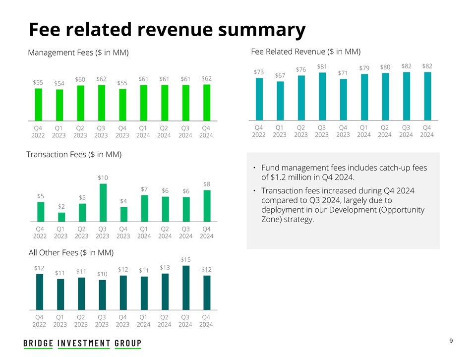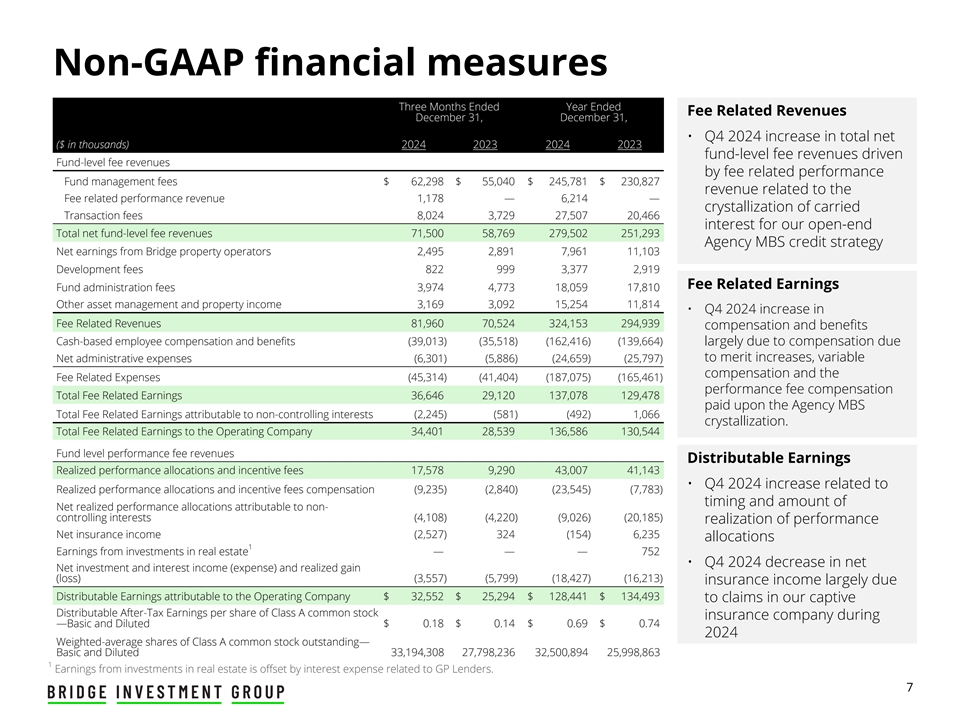 Non-GAAP financial measures Three Months Ended Year Ended Fee Related Revenues December 31, December 31, • Q4 2024 increase in total net ($ in thousands) 2024 2023 2024 2023 fund-level fee revenues driven Fund-level fee revenues by fee related performance Fund management fees $ 62,298 $ 55,040 $ 245,781 $ 230,827 revenue related to the Fee related performance revenue 1,178 — 6,214 — crystallization of carried Transaction fees 8,024 3,729 27,507 20,466 interest for our open-end Total net fund-level fee revenues 71,500 58,769 279,502 251,293 Agency MBS credit strategy Net earnings from Bridge property operators 2,495 2,891 7,961 11,103 Development fees 822 999 3,377 2,919 Fee Related Earnings Fund administration fees 3,974 4,773 18,059 17,810 Other asset management and property income 3,169 3,092 15,254 11,814 • Q4 2024 increase in Fee Related Revenues 81,960 70,524 324,153 294,939 compensation and benefits Cash-based employee compensation and benefits (39,013) (35,518) (162,416) (139,664) largely due to compensation due to merit increases, variable Net administrative expenses (6,301) (5,886) (24,659) (25,797) compensation and the Fee Related Expenses (45,314) (41,404) (187,075) (165,461) performance fee compensation Total Fee Related Earnings 36,646 29,120 137,078 129,478 paid upon the Agency MBS Total Fee Related Earnings attributable to non-controlling interests (2,245) (581) (492) 1,066 crystallization. Total Fee Related Earnings to the Operating Company 34,401 28,539 136,586 130,544 Fund level performance fee revenues Distributable Earnings Realized performance allocations and incentive fees 17,578 9,290 43,007 41,143 • Q4 2024 increase related to Realized performance allocations and incentive fees compensation (9,235) (2,840) (23,545) (7,783) timing and amount of Net realized performance allocations attributable to non- controlling interests (4,108) (4,220) (9,026) (20,185) realization of performance Net insurance income (2,527) 324 (154) 6,235 allocations 1 Earnings from investments in real estate — — — 752 • Q4 2024 decrease in net Net investment and interest income (expense) and realized gain (loss) (3,557) (5,799) (18,427) (16,213) insurance income largely due Distributable Earnings attributable to the Operating Company $ 32,552 $ 25,294 $ 128,441 $ 134,493 to claims in our captive Distributable After-Tax Earnings per share of Class A common stock insurance company during —Basic and Diluted $ 0.18 $ 0.14 $ 0.69 $ 0.74 2024 Weighted-average shares of Class A common stock outstanding— Basic and Diluted 33,194,308 27,798,236 32,500,894 25,998,863 1 Earnings from investments in real estate is offset by interest expense related to GP Lenders. 7