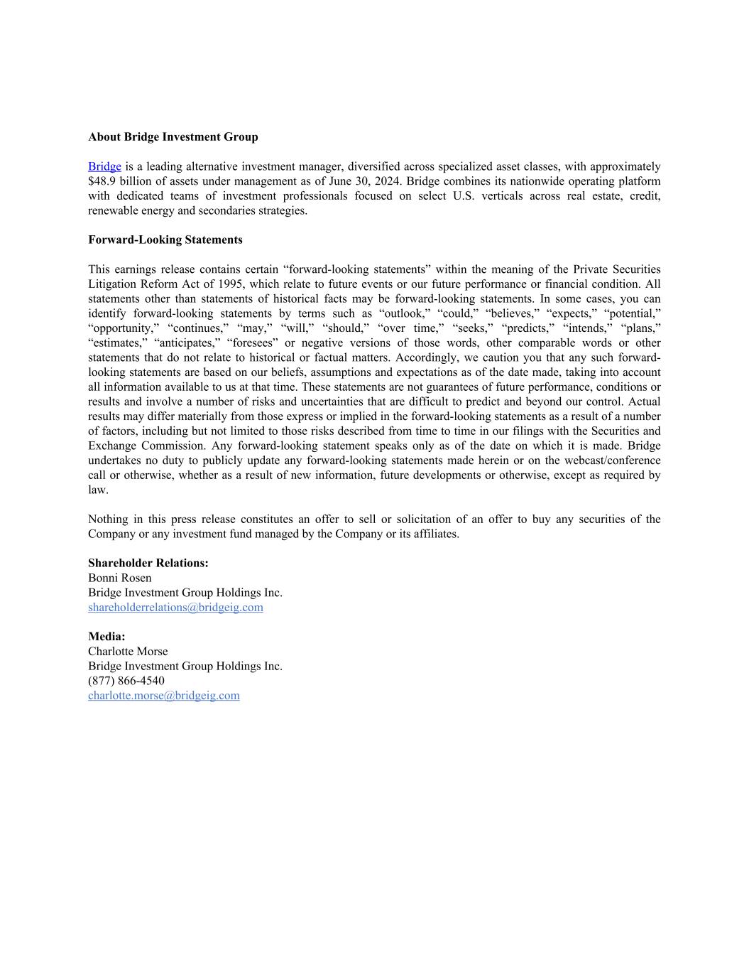 About Bridge Investment Group Bridge is a leading alternative investment manager, diversified across specialized asset classes, with approximately $48.9 billion of assets under management as of June 30, 2024. Bridge combines its nationwide operating platform with dedicated teams of investment professionals focused on select U.S. verticals across real estate, credit, renewable energy and secondaries strategies. Forward-Looking Statements This earnings release contains certain “forward-looking statements” within the meaning of the Private Securities Litigation Reform Act of 1995, which relate to future events or our future performance or financial condition. All statements other than statements of historical facts may be forward-looking statements. In some cases, you can identify forward-looking statements by terms such as “outlook,” “could,” “believes,” “expects,” “potential,” “opportunity,” “continues,” “may,” “will,” “should,” “over time,” “seeks,” “predicts,” “intends,” “plans,” “estimates,” “anticipates,” “foresees” or negative versions of those words, other comparable words or other statements that do not relate to historical or factual matters. Accordingly, we caution you that any such forward- looking statements are based on our beliefs, assumptions and expectations as of the date made, taking into account all information available to us at that time. These statements are not guarantees of future performance, conditions or results and involve a number of risks and uncertainties that are difficult to predict and beyond our control. Actual results may differ materially from those express or implied in the forward-looking statements as a result of a number of factors, including but not limited to those risks described from time to time in our filings with the Securities and Exchange Commission. Any forward-looking statement speaks only as of the date on which it is made. Bridge undertakes no duty to publicly update any forward-looking statements made herein or on the webcast/conference call or otherwise, whether as a result of new information, future developments or otherwise, except as required by law. Nothing in this press release constitutes an offer to sell or solicitation of an offer to buy any securities of the Company or any investment fund managed by the Company or its affiliates. Shareholder Relations: Bonni Rosen Bridge Investment Group Holdings Inc. shareholderrelations@bridgeig.com Media: Charlotte Morse Bridge Investment Group Holdings Inc. (877) 866-4540 charlotte.morse@bridgeig.com
