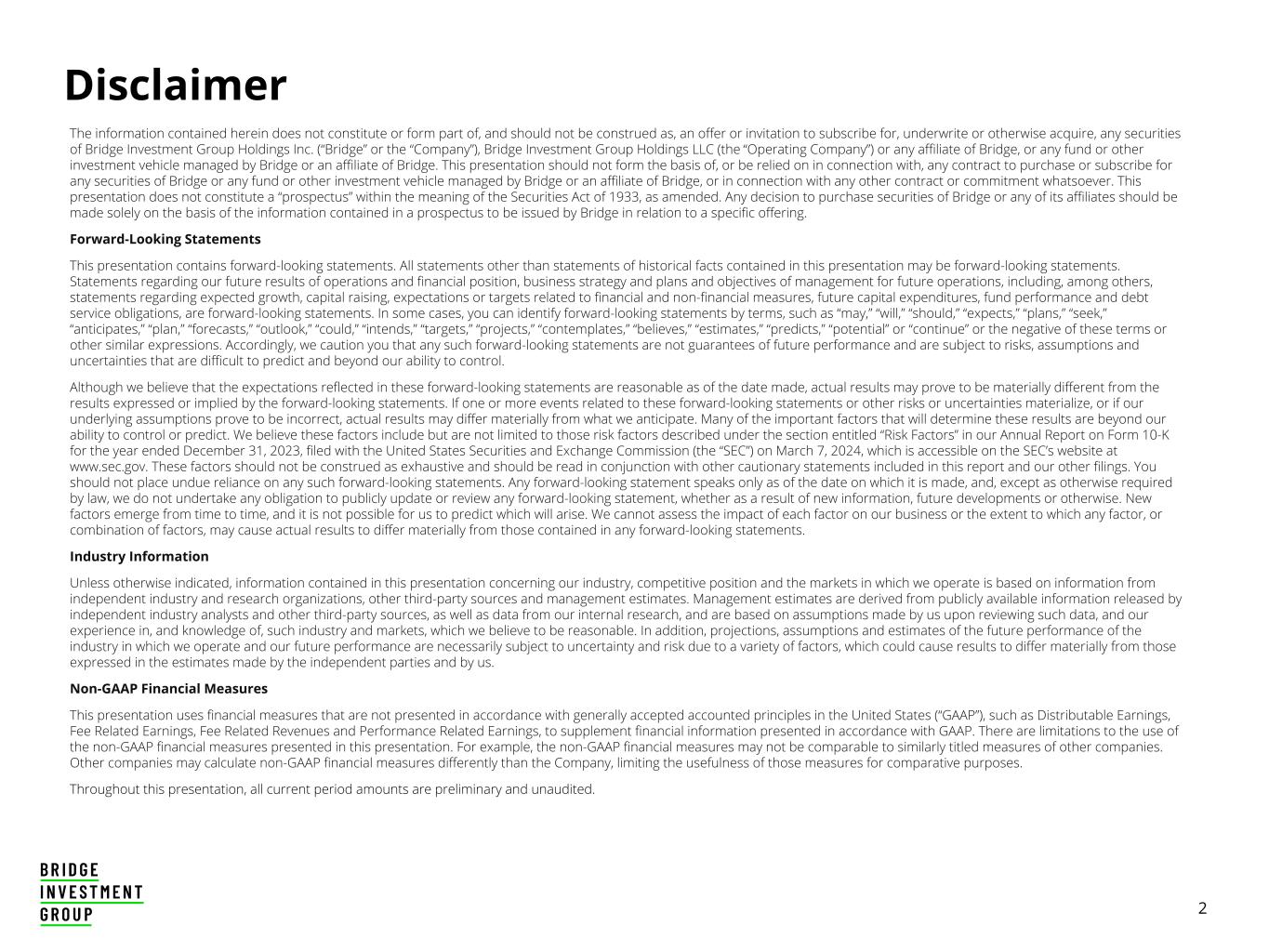 2 Disclaimer The information contained herein does not constitute or form part of, and should not be construed as, an offer or invitation to subscribe for, underwrite or otherwise acquire, any securities of Bridge Investment Group Holdings Inc. (“Bridge” or the “Company”), Bridge Investment Group Holdings LLC (the “Operating Company”) or any affiliate of Bridge, or any fund or other investment vehicle managed by Bridge or an affiliate of Bridge. This presentation should not form the basis of, or be relied on in connection with, any contract to purchase or subscribe for any securities of Bridge or any fund or other investment vehicle managed by Bridge or an affiliate of Bridge, or in connection with any other contract or commitment whatsoever. This presentation does not constitute a “prospectus” within the meaning of the Securities Act of 1933, as amended. Any decision to purchase securities of Bridge or any of its affiliates should be made solely on the basis of the information contained in a prospectus to be issued by Bridge in relation to a specific offering. Forward-Looking Statements This presentation contains forward-looking statements. All statements other than statements of historical facts contained in this presentation may be forward-looking statements. Statements regarding our future results of operations and financial position, business strategy and plans and objectives of management for future operations, including, among others, statements regarding expected growth, capital raising, expectations or targets related to financial and non-financial measures, future capital expenditures, fund performance and debt service obligations, are forward-looking statements. In some cases, you can identify forward-looking statements by terms, such as “may,” “will,” “should,” “expects,” “plans,” “seek,” “anticipates,” “plan,” “forecasts,” “outlook,” “could,” “intends,” “targets,” “projects,” “contemplates,” “believes,” “estimates,” “predicts,” “potential” or “continue” or the negative of these terms or other similar expressions. Accordingly, we caution you that any such forward-looking statements are not guarantees of future performance and are subject to risks, assumptions and uncertainties that are difficult to predict and beyond our ability to control. Although we believe that the expectations reflected in these forward-looking statements are reasonable as of the date made, actual results may prove to be materially different from the results expressed or implied by the forward-looking statements. If one or more events related to these forward-looking statements or other risks or uncertainties materialize, or if our underlying assumptions prove to be incorrect, actual results may differ materially from what we anticipate. Many of the important factors that will determine these results are beyond our ability to control or predict. We believe these factors include but are not limited to those risk factors described under the section entitled “Risk Factors” in our Annual Report on Form 10-K for the year ended December 31, 2023, filed with the United States Securities and Exchange Commission (the “SEC”) on March 7, 2024, which is accessible on the SEC’s website at www.sec.gov. These factors should not be construed as exhaustive and should be read in conjunction with other cautionary statements included in this report and our other filings. You should not place undue reliance on any such forward-looking statements. Any forward-looking statement speaks only as of the date on which it is made, and, except as otherwise required by law, we do not undertake any obligation to publicly update or review any forward-looking statement, whether as a result of new information, future developments or otherwise. New factors emerge from time to time, and it is not possible for us to predict which will arise. We cannot assess the impact of each factor on our business or the extent to which any factor, or combination of factors, may cause actual results to differ materially from those contained in any forward-looking statements. Industry Information Unless otherwise indicated, information contained in this presentation concerning our industry, competitive position and the markets in which we operate is based on information from independent industry and research organizations, other third-party sources and management estimates. Management estimates are derived from publicly available information released by independent industry analysts and other third-party sources, as well as data from our internal research, and are based on assumptions made by us upon reviewing such data, and our experience in, and knowledge of, such industry and markets, which we believe to be reasonable. In addition, projections, assumptions and estimates of the future performance of the industry in which we operate and our future performance are necessarily subject to uncertainty and risk due to a variety of factors, which could cause results to differ materially from those expressed in the estimates made by the independent parties and by us. Non-GAAP Financial Measures This presentation uses financial measures that are not presented in accordance with generally accepted accounted principles in the United States (“GAAP”), such as Distributable Earnings, Fee Related Earnings, Fee Related Revenues and Performance Related Earnings, to supplement financial information presented in accordance with GAAP. There are limitations to the use of the non-GAAP financial measures presented in this presentation. For example, the non-GAAP financial measures may not be comparable to similarly titled measures of other companies. Other companies may calculate non-GAAP financial measures differently than the Company, limiting the usefulness of those measures for comparative purposes. Throughout this presentation, all current period amounts are prelimi